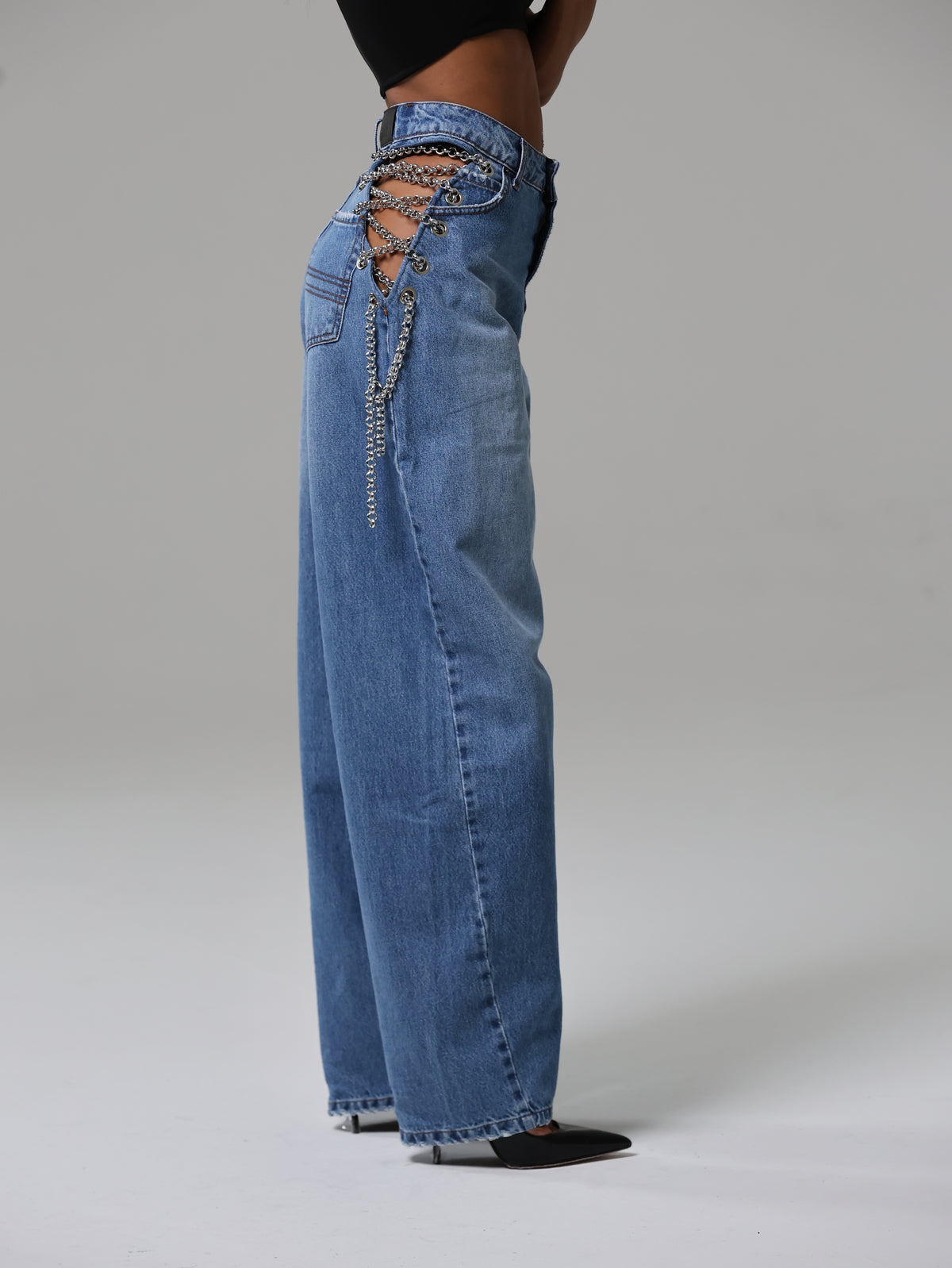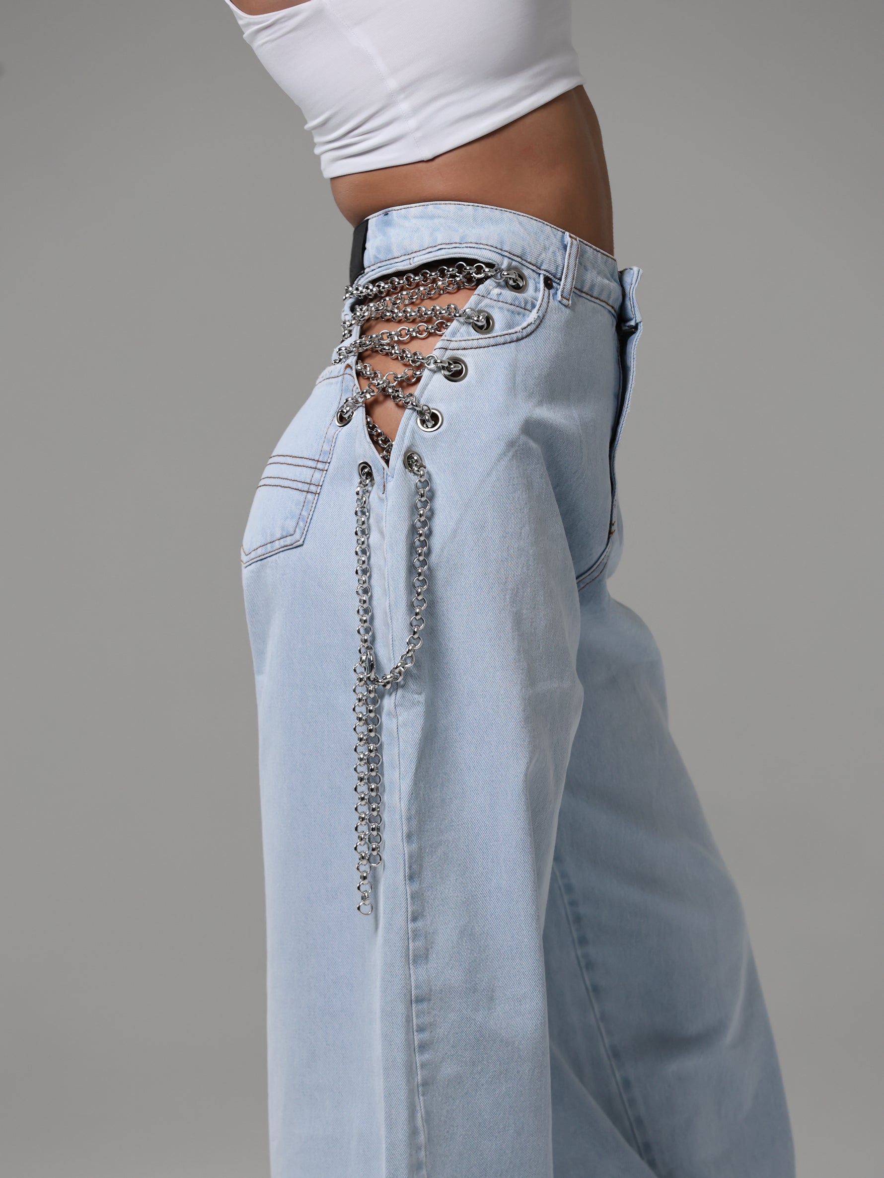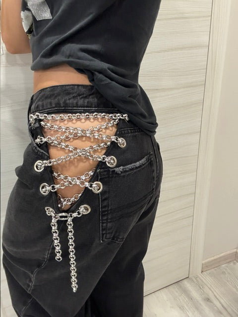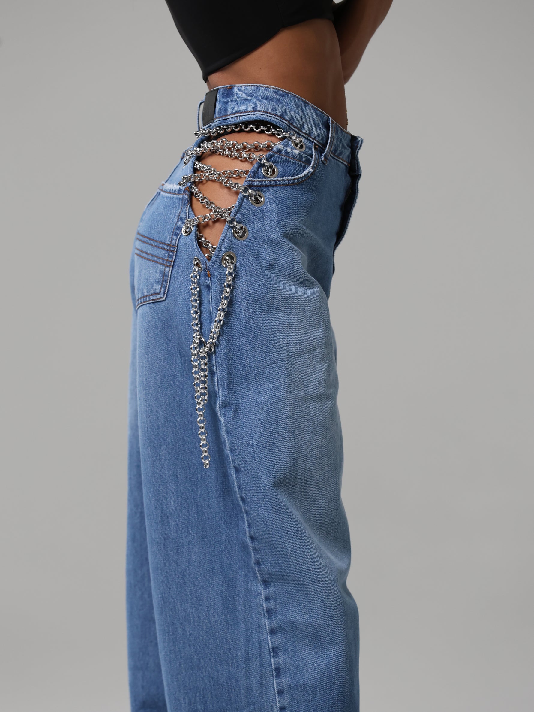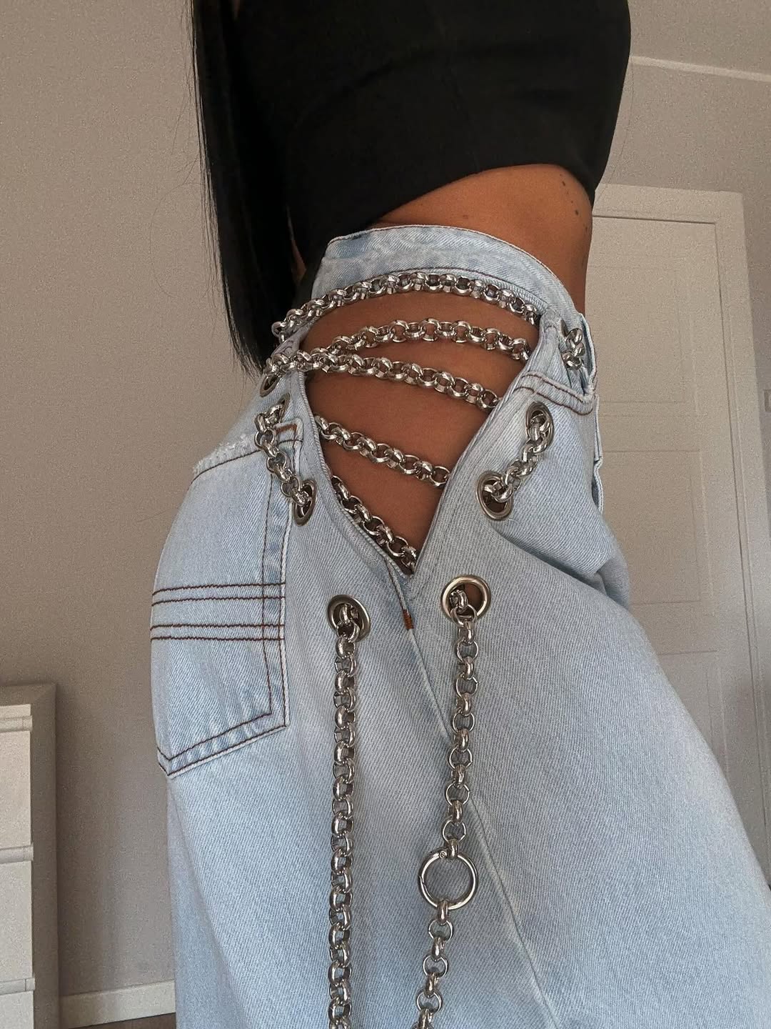 Dettaglio metallico, effetto magnetico: le catene sui fianchi impreziosiscono il capo, mescolando audacia e modernità in un jeans che cattura lo sguardo senza sforzo.