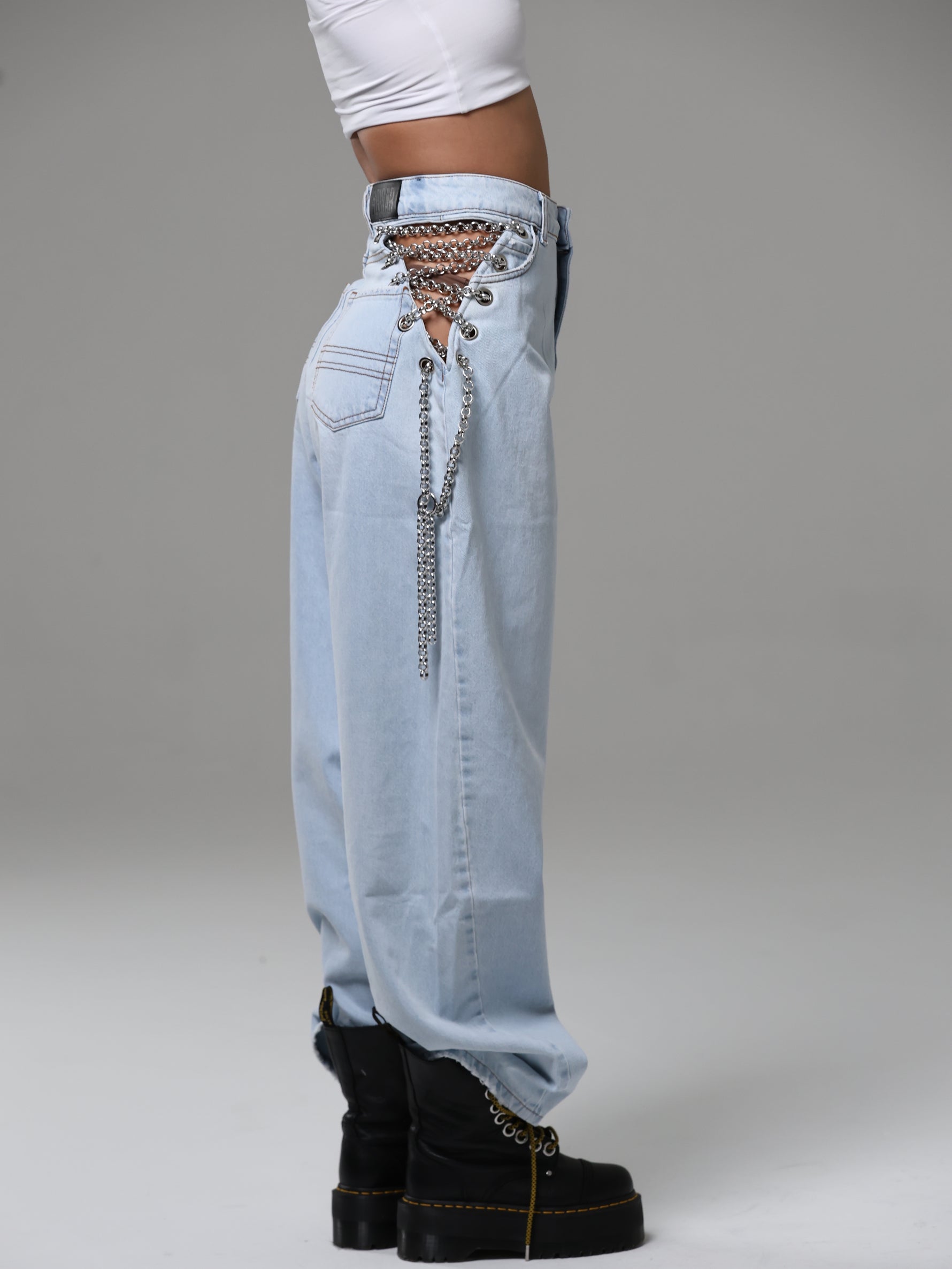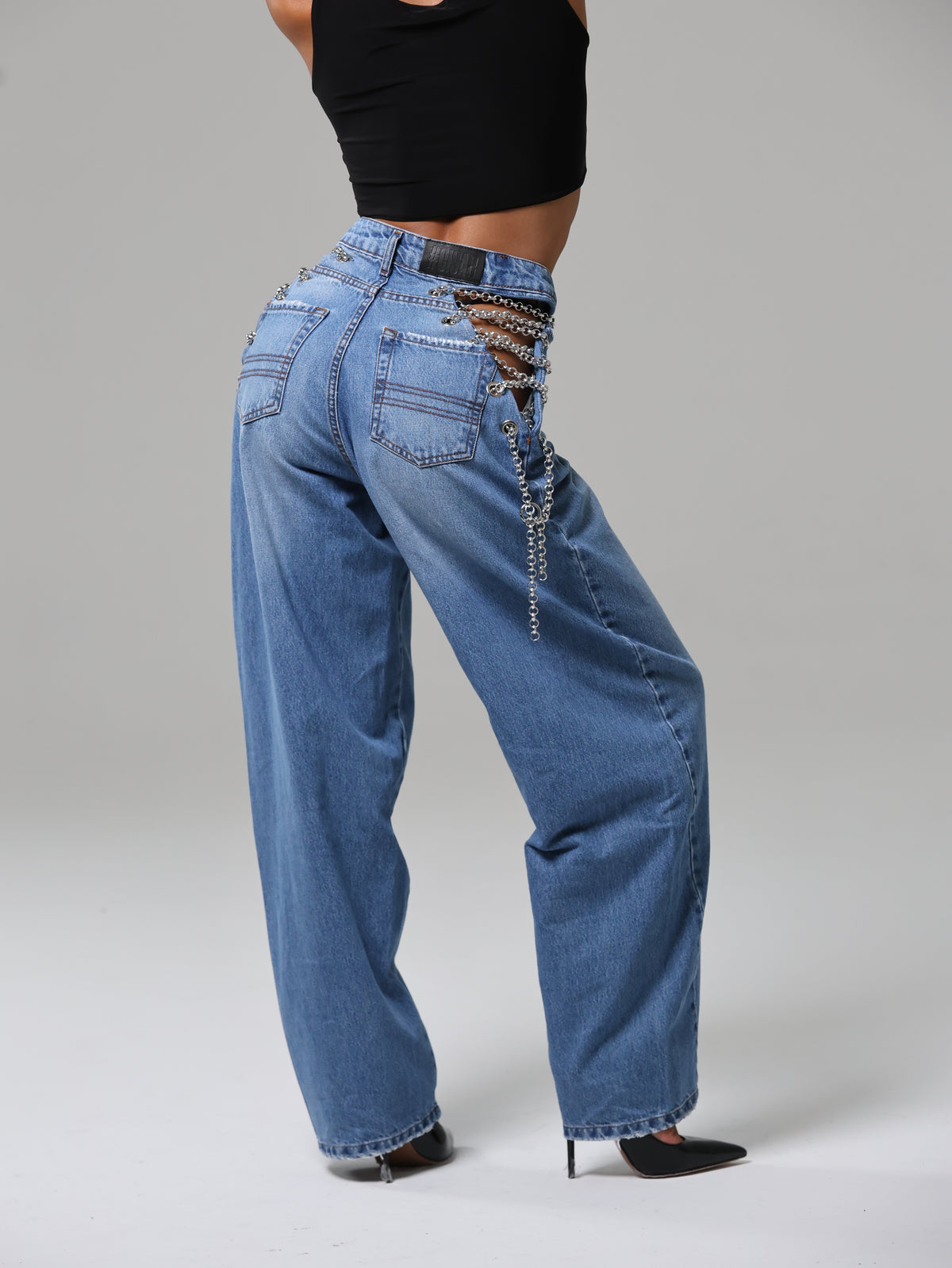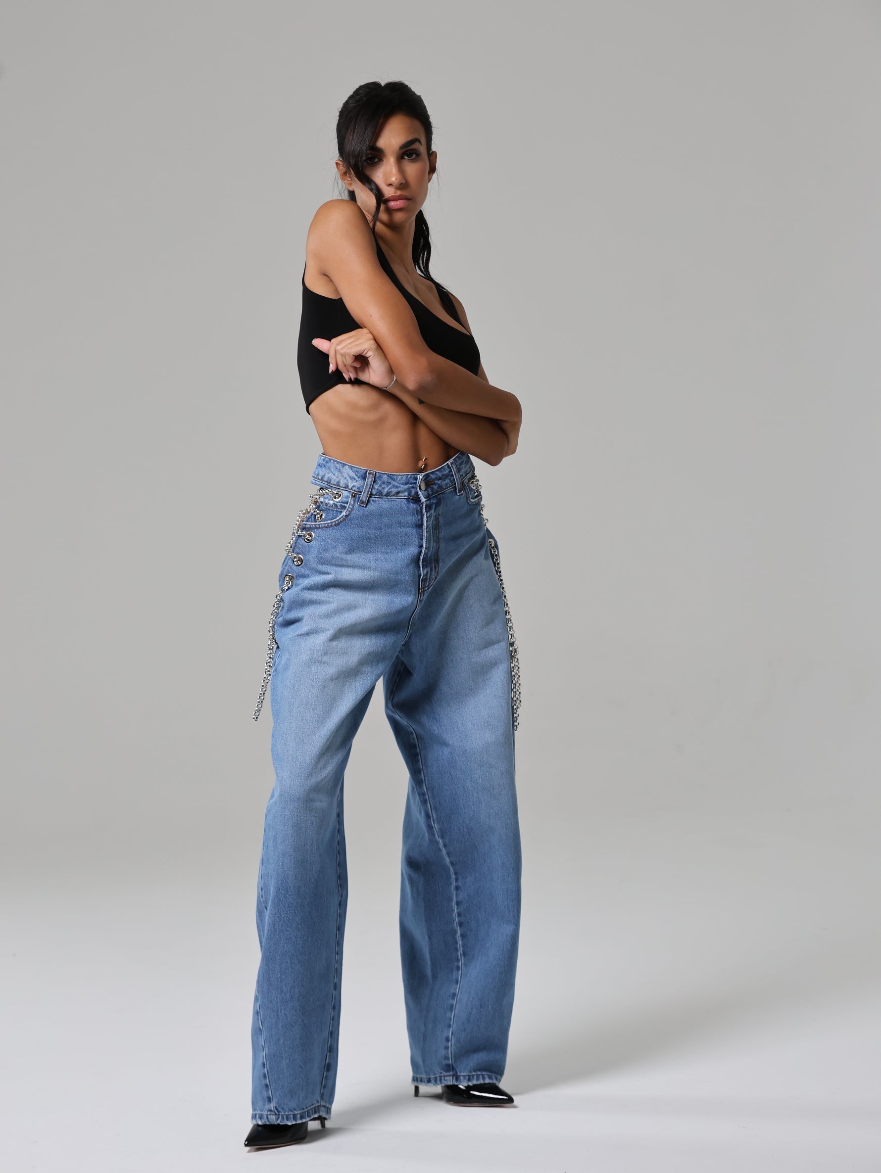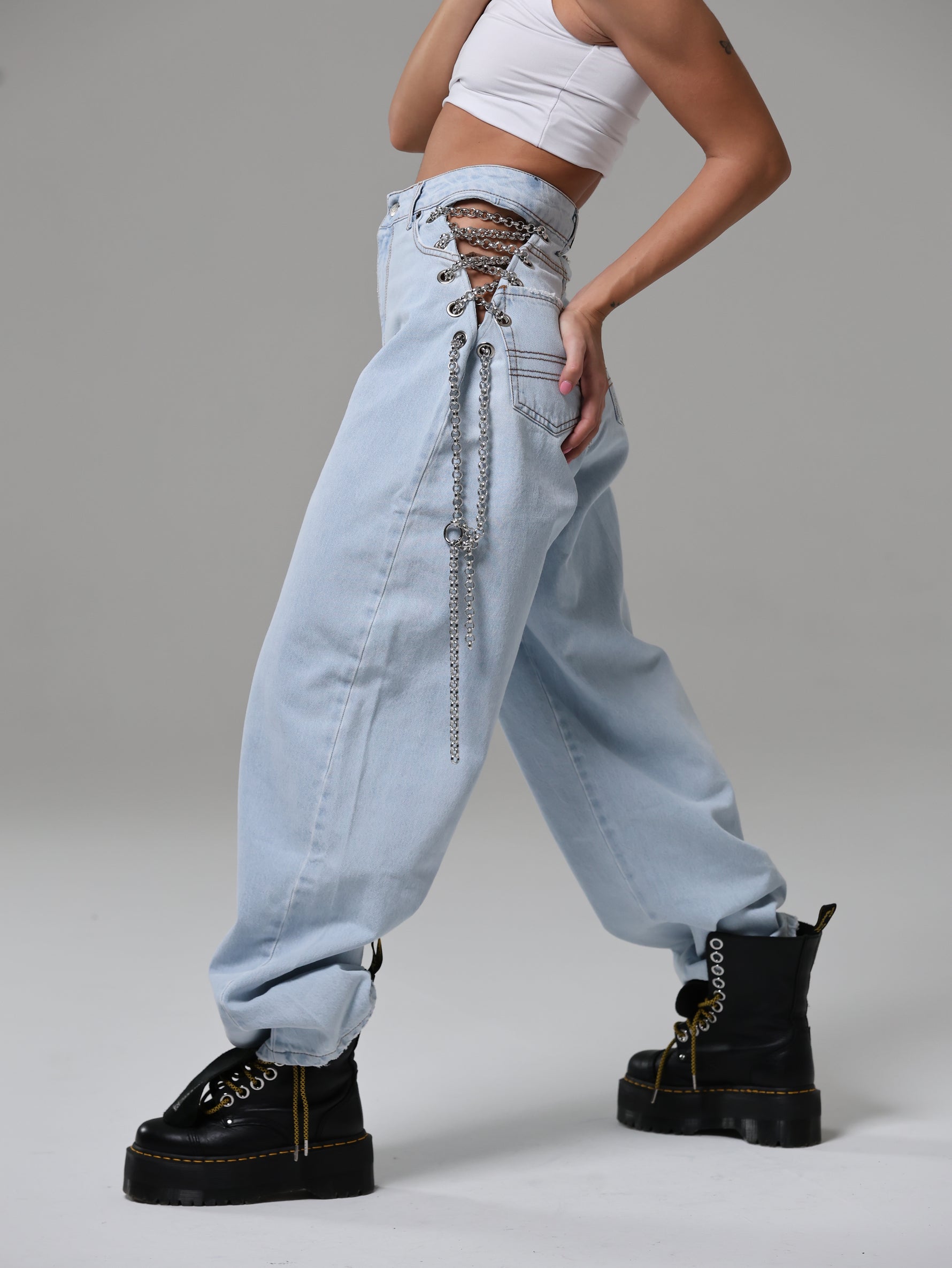 Dettaglio metallico, effetto magnetico: le catene sui fianchi impreziosiscono il capo, mescolando audacia e modernità in un jeans che cattura lo sguardo senza sforzo.
