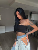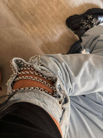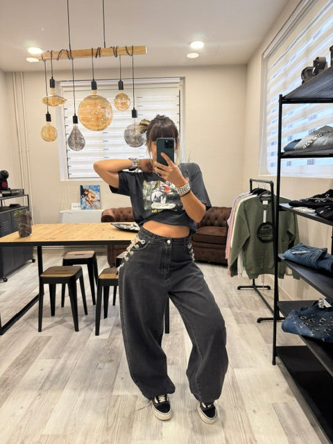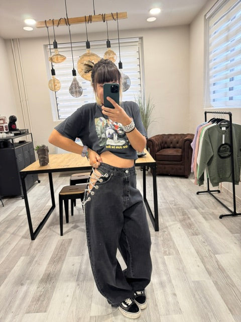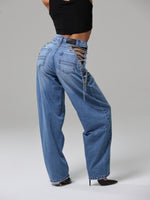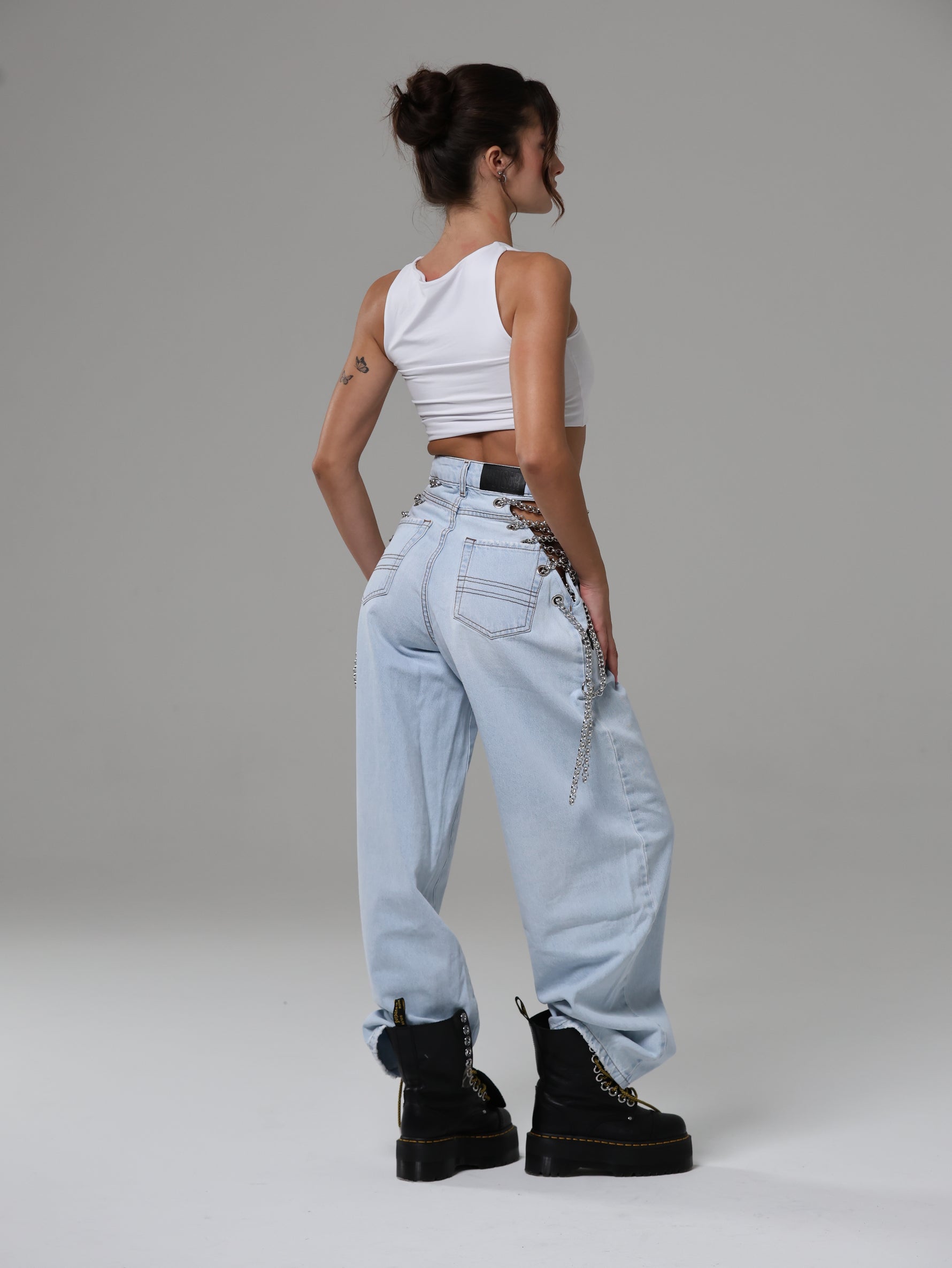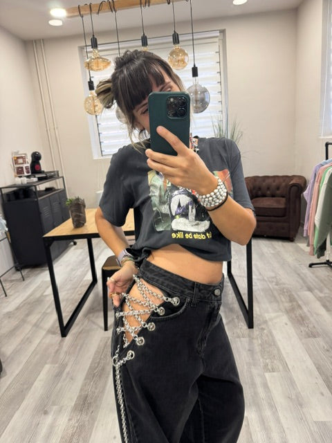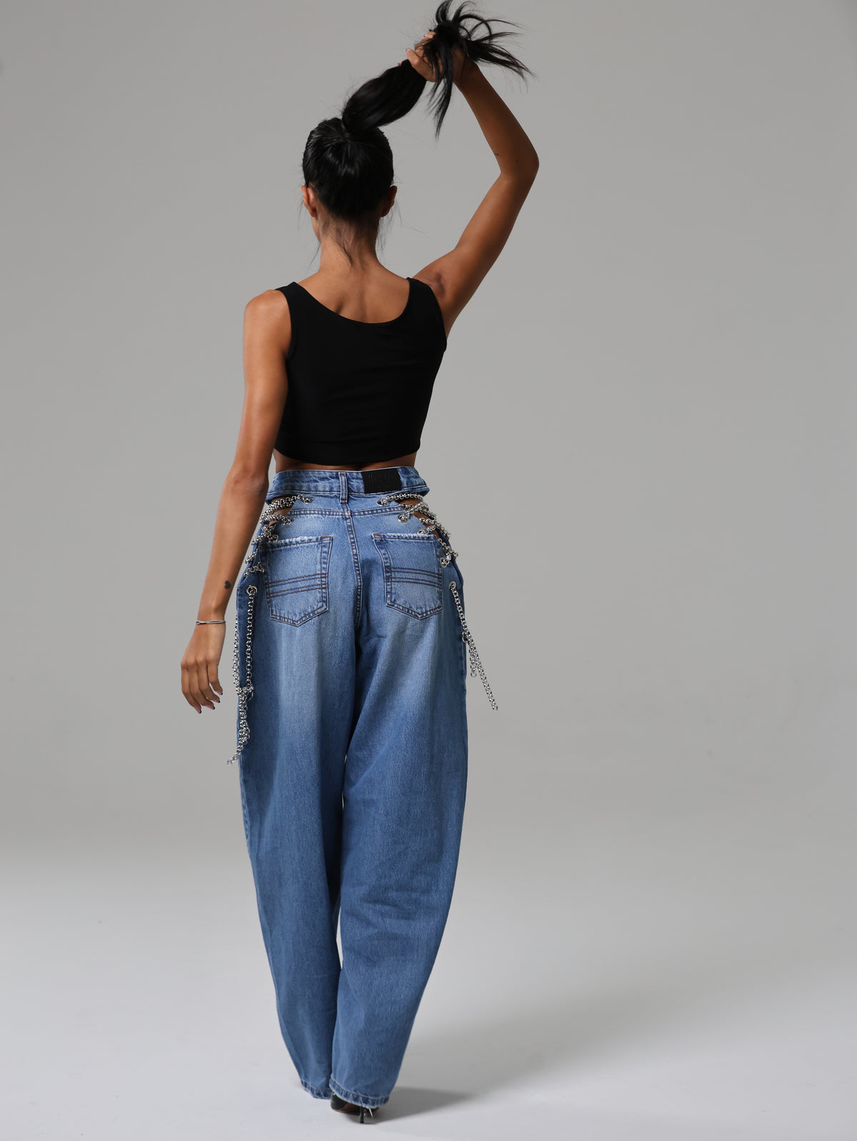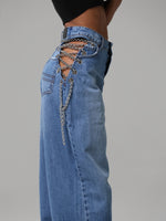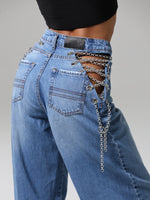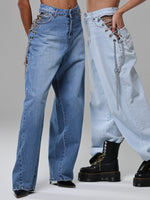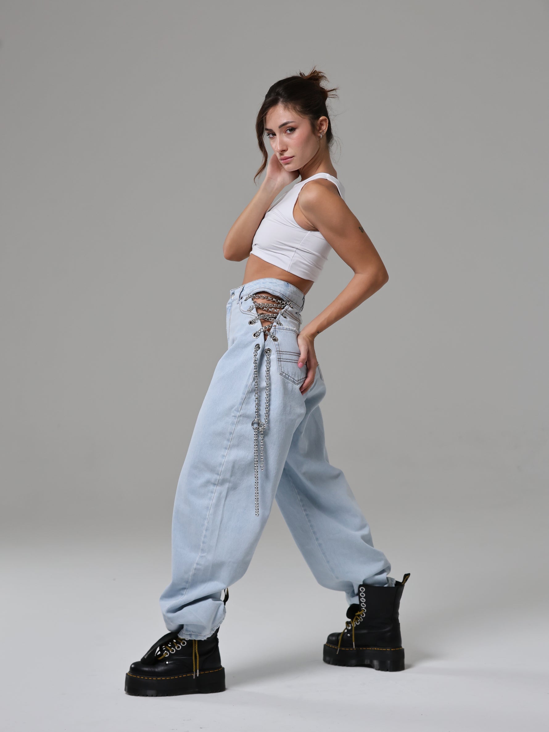 Dettaglio metallico, effetto magnetico: le catene sui fianchi impreziosiscono il capo, mescolando audacia e modernità in un jeans che cattura lo sguardo senza sforzo.