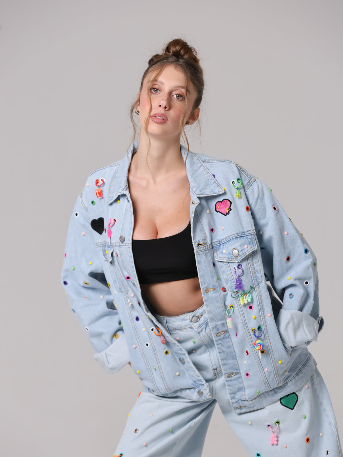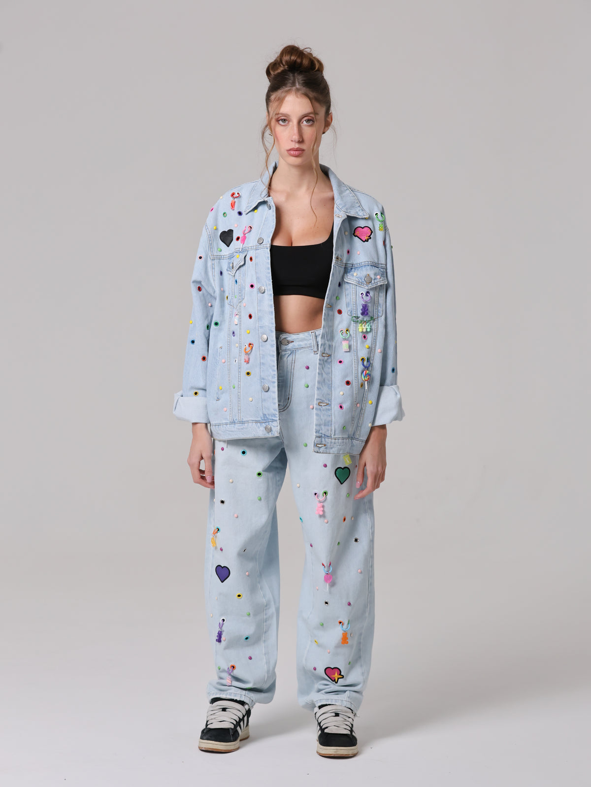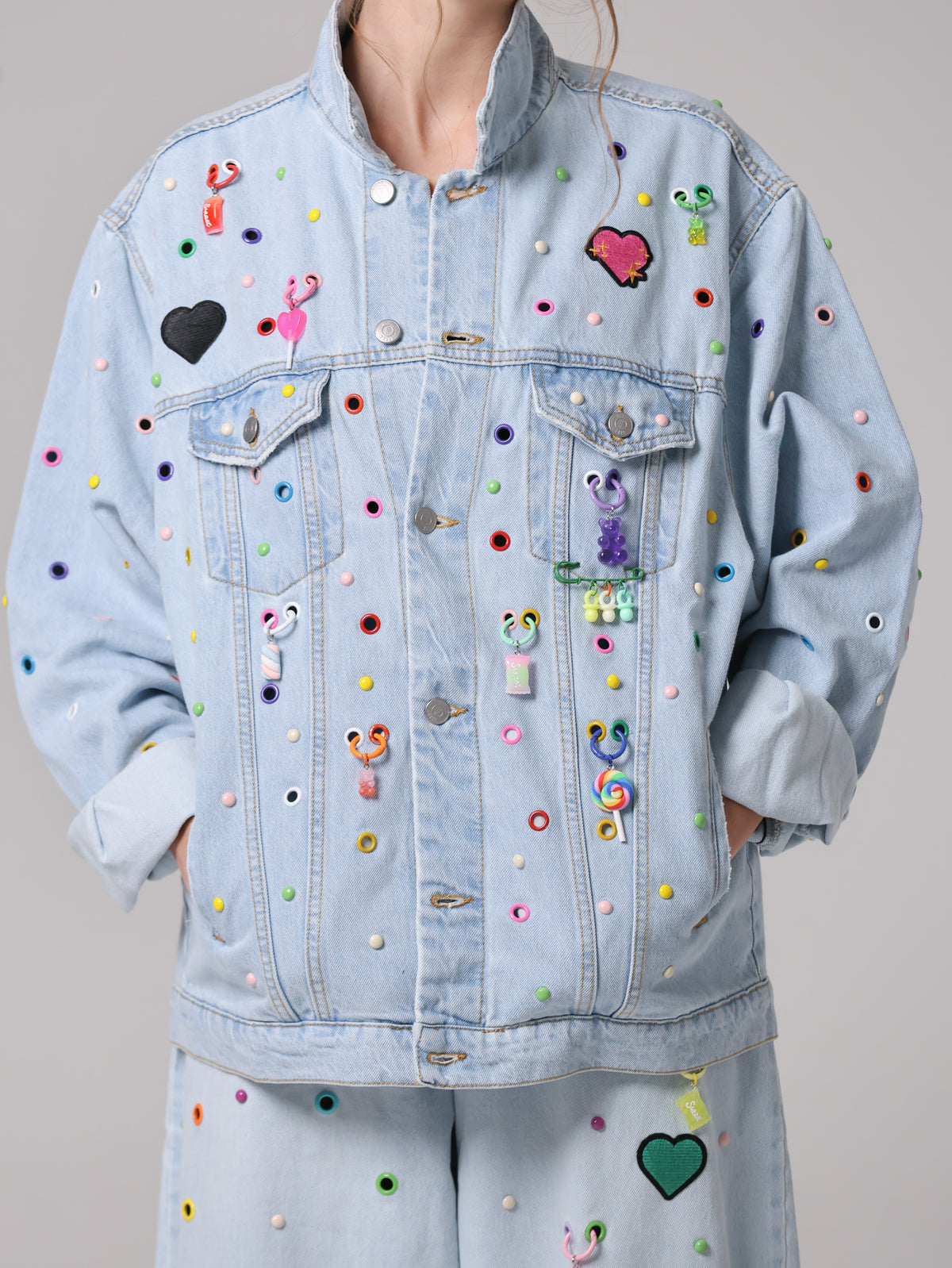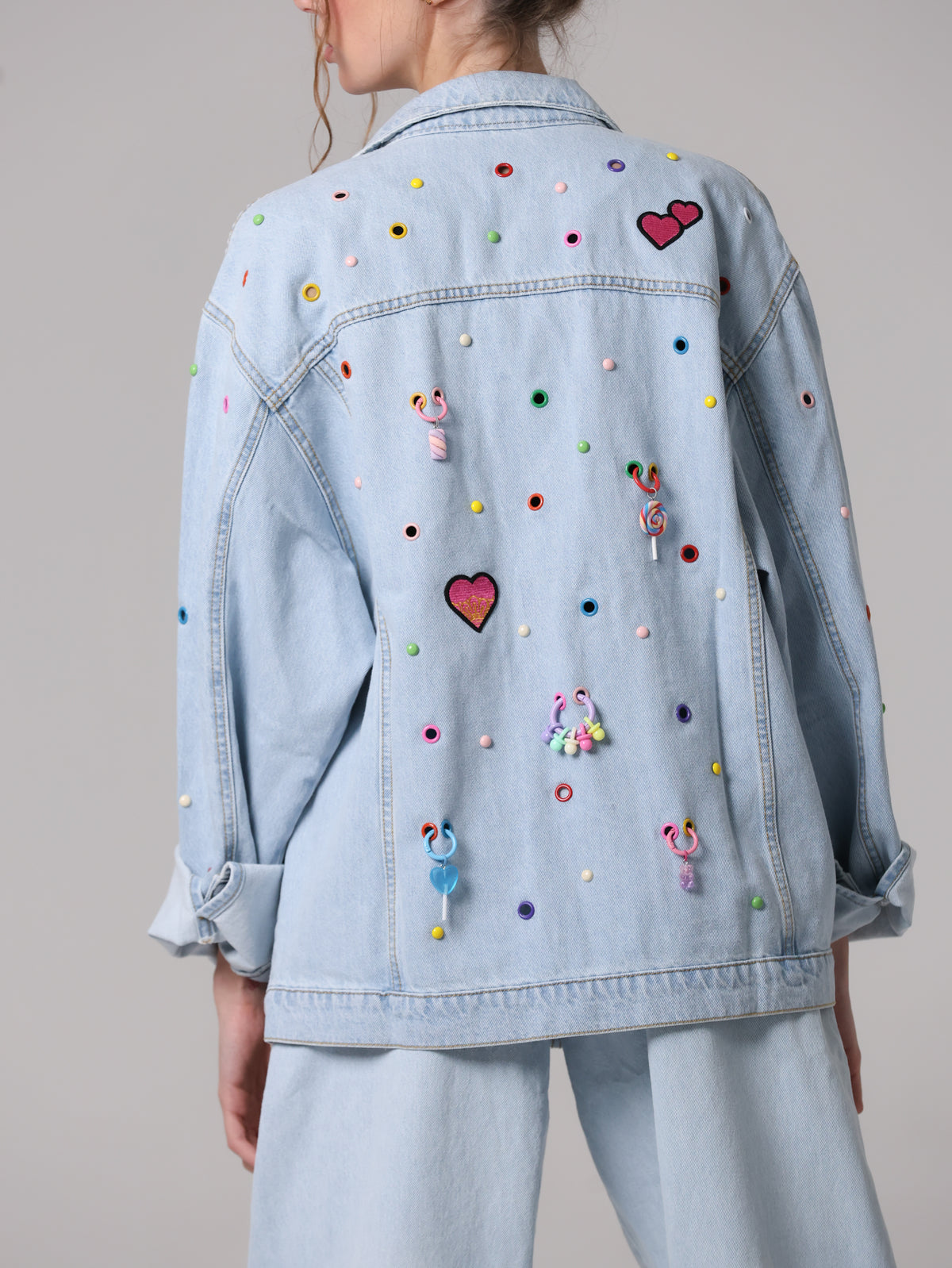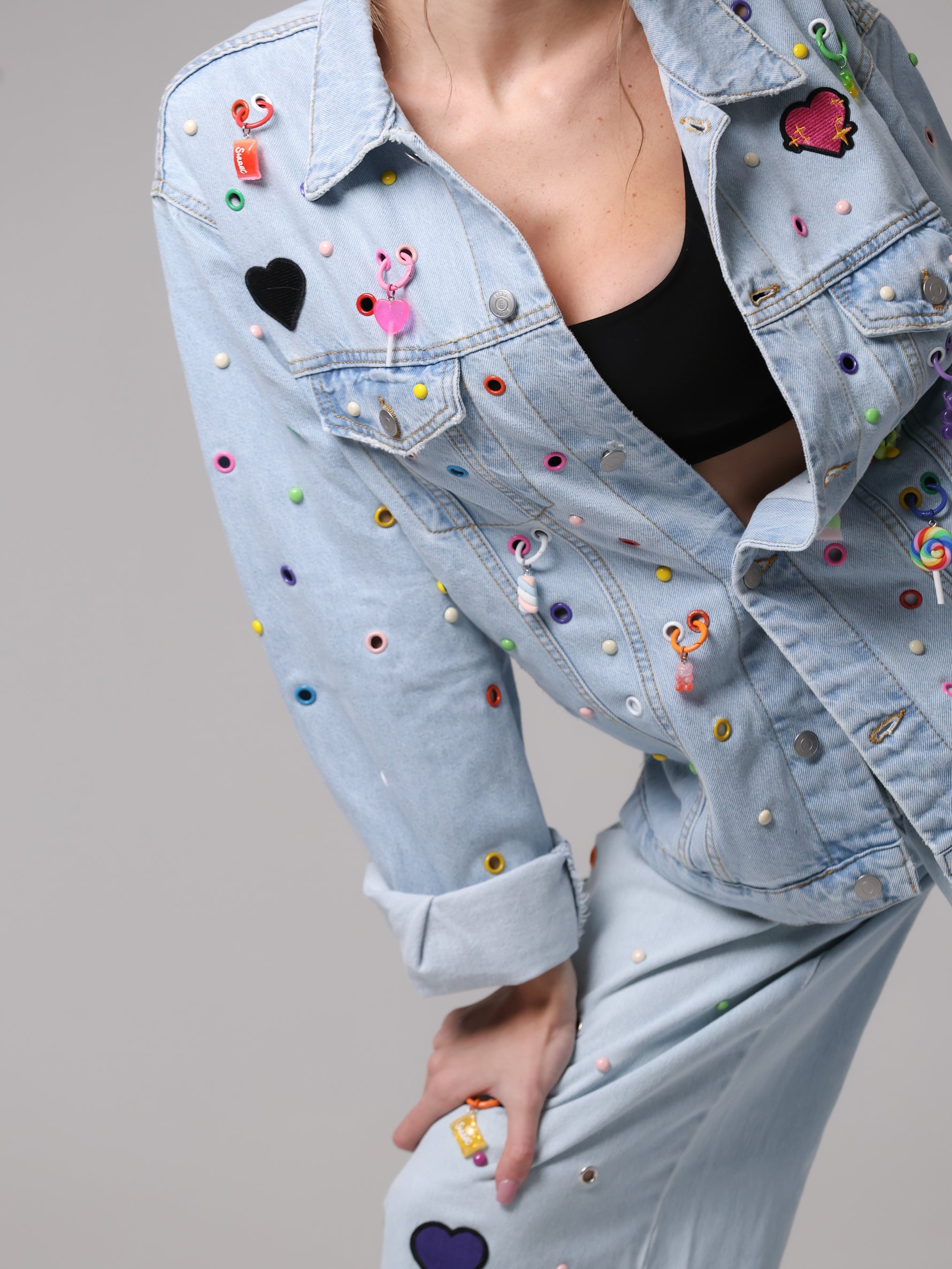 Arricchita da un mix di borchie, occhielli e charms colorati che anima la superficie, trasformando il capo in un'espressione giocosa di stile contemporaneo. Un vero statement di personalità e creatività.