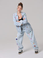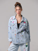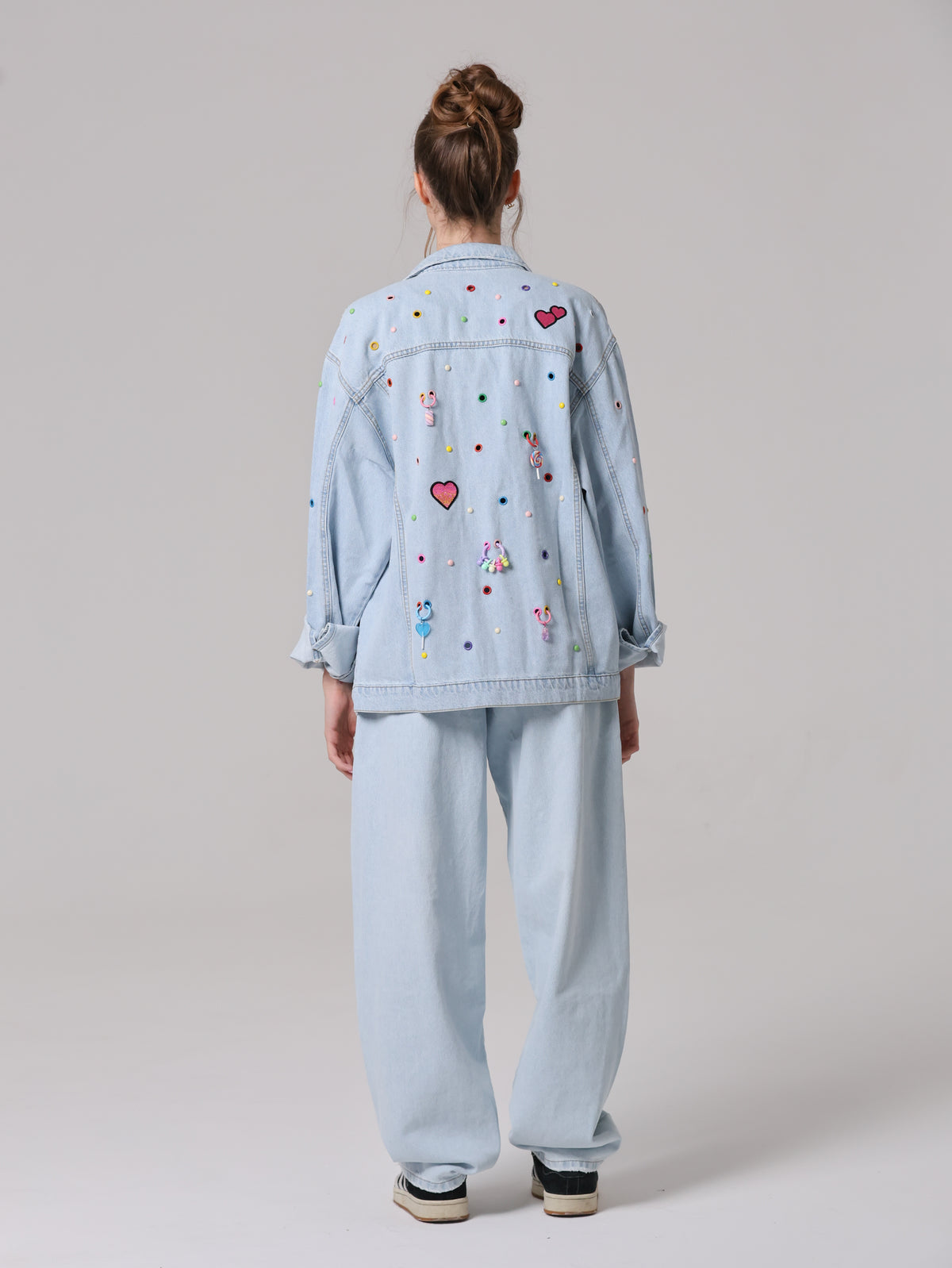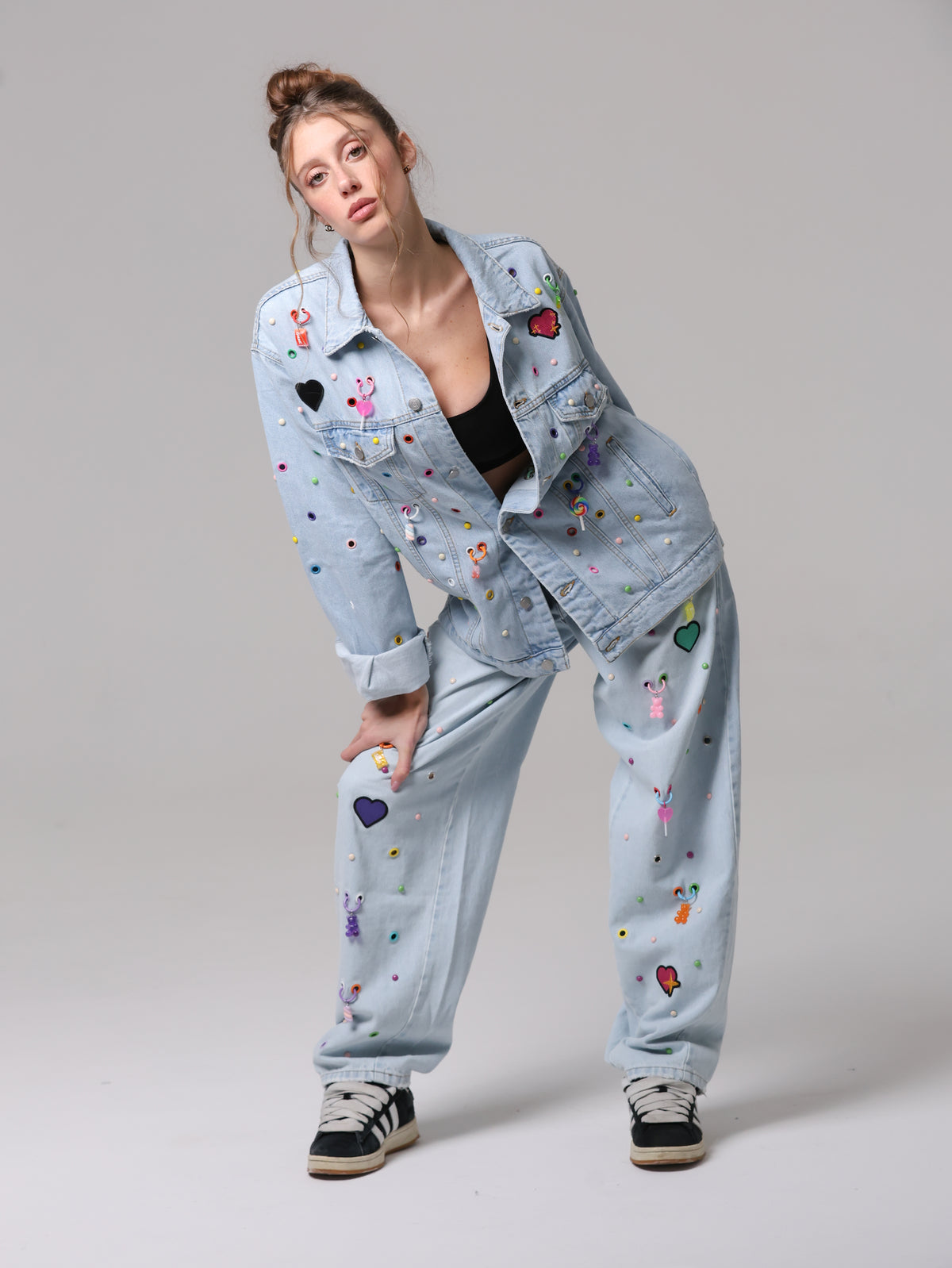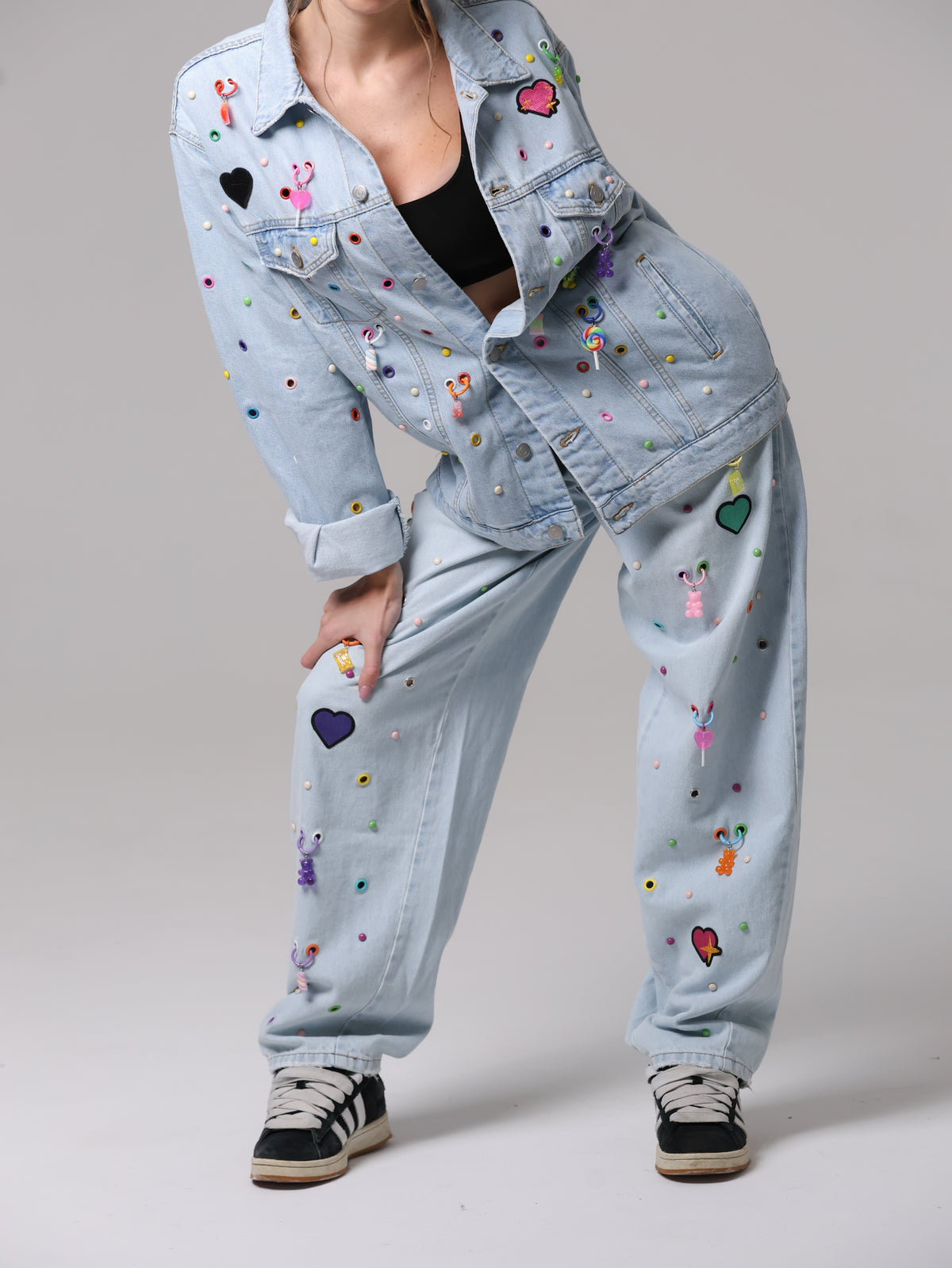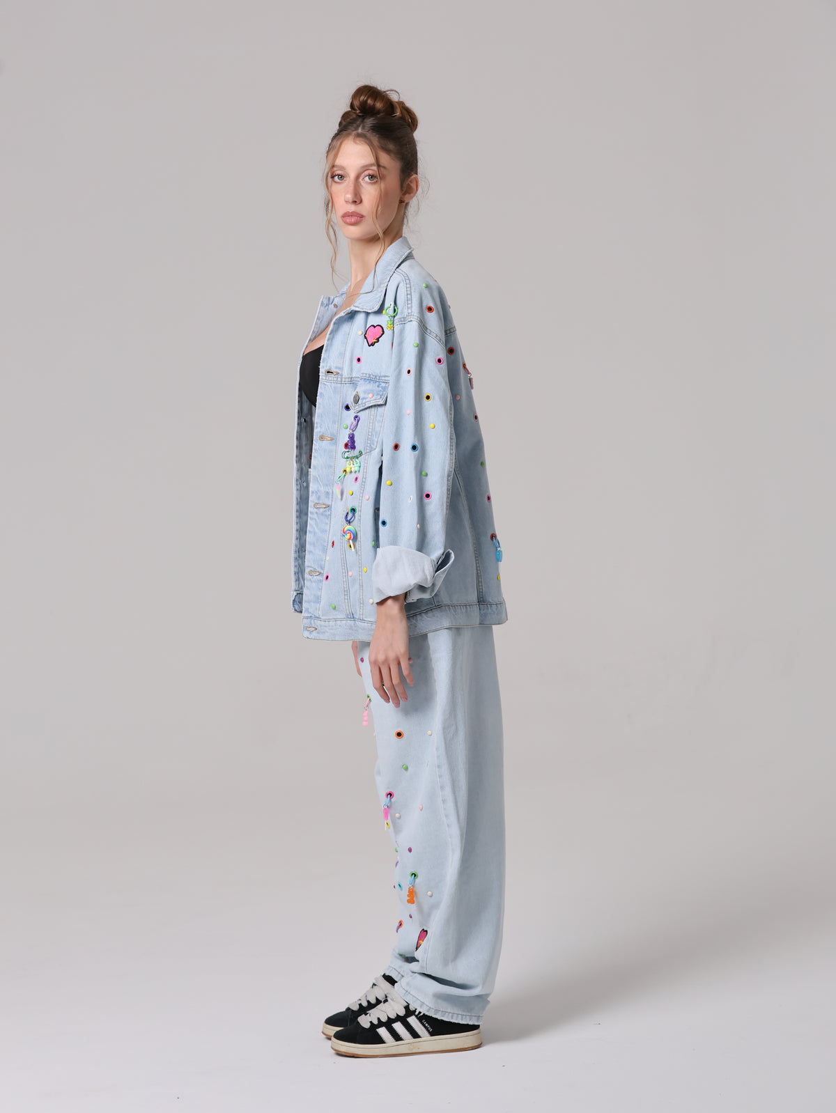Arricchita da un mix di borchie, occhielli e charms colorati che anima la superficie, trasformando il capo in un'espressione giocosa di stile contemporaneo. Un vero statement di personalità e creatività.