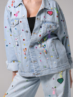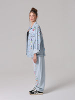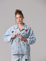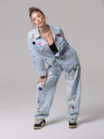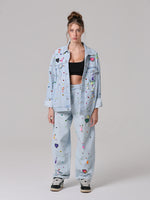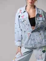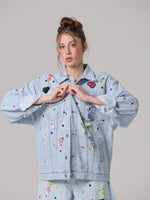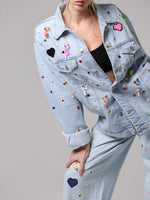 Questa giacca in denim è stata trasformata attraverso un lavoro interamente manuale, che la rende unica.