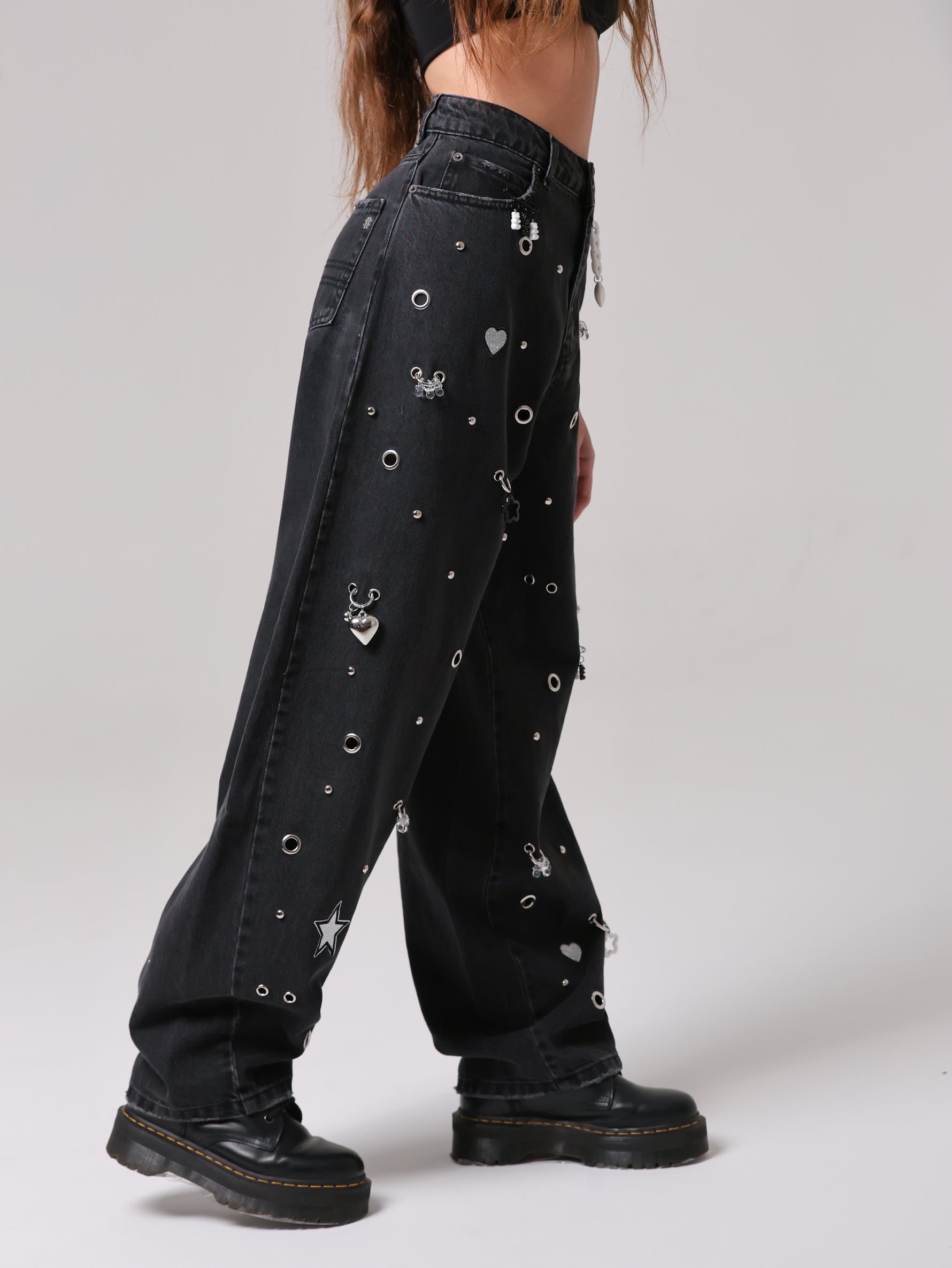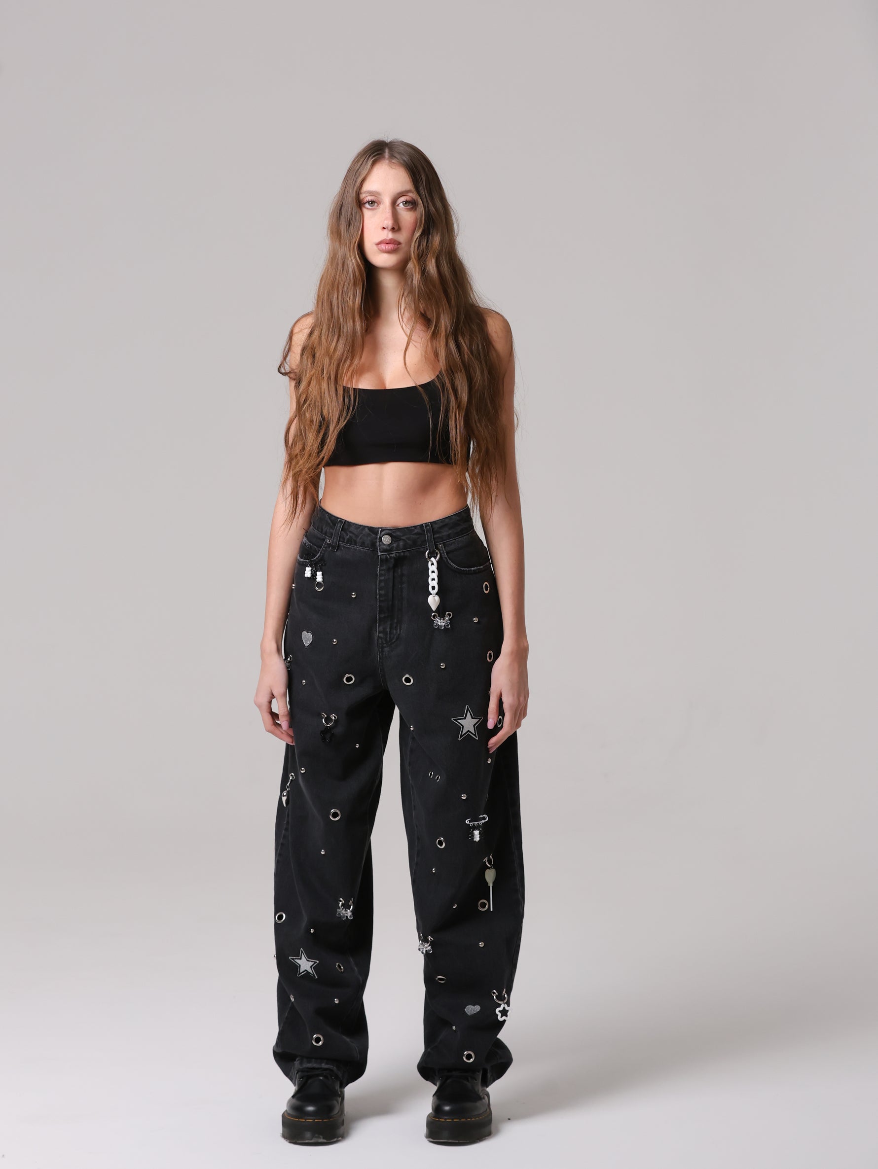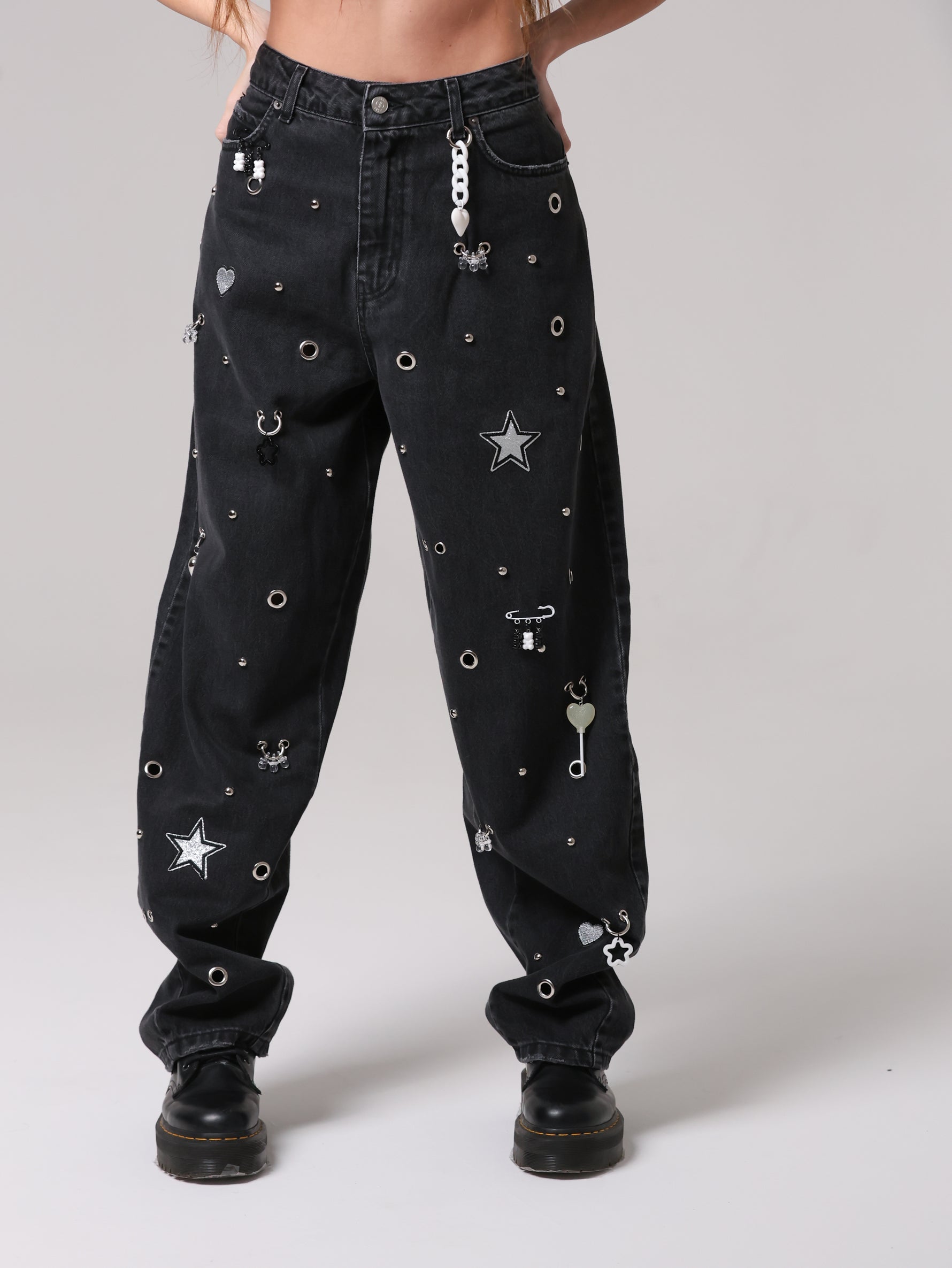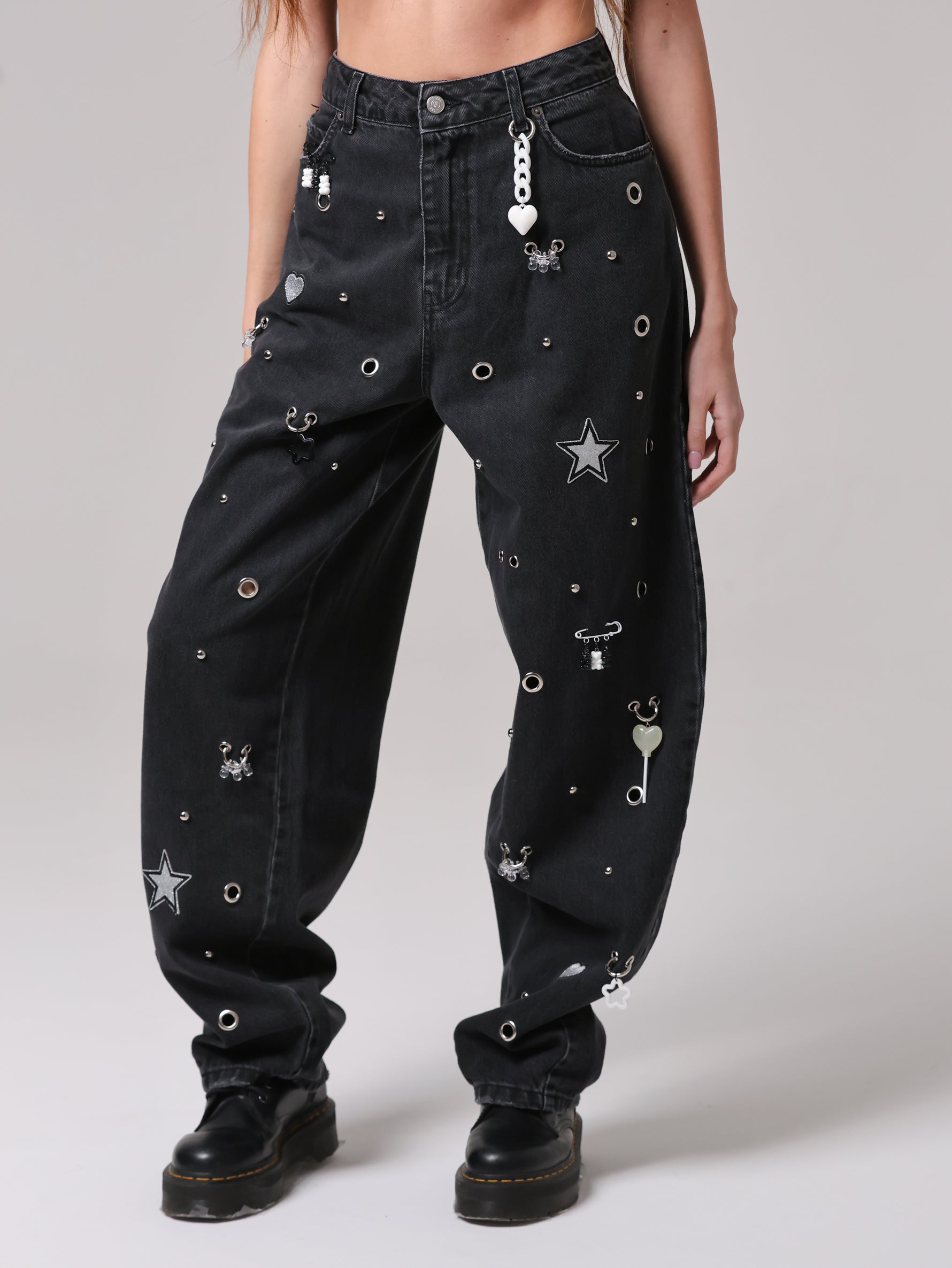 Questo non è un semplice jeans, ma un capo che non ha eguali: un mix di borchie, occhielli e charms anima la superficie, trasformando il capo in un'espressione giocosa di stile contemporaneo. Un vero statement di personalità e creatività.