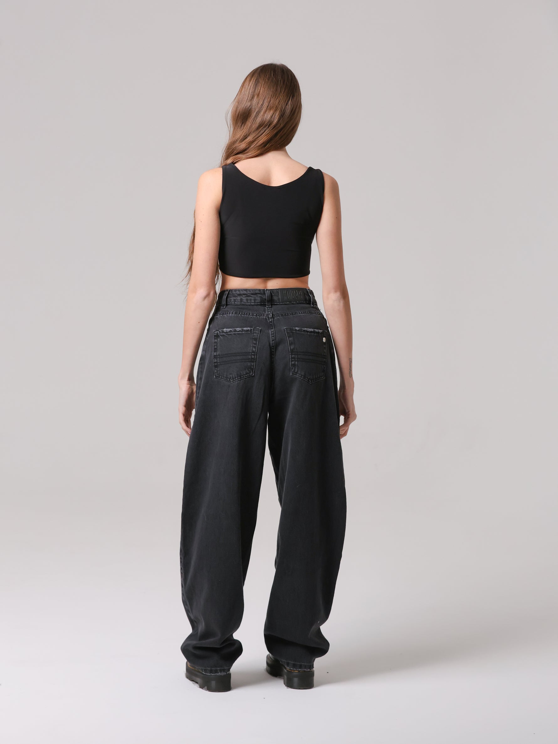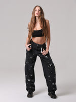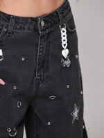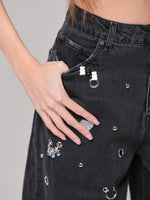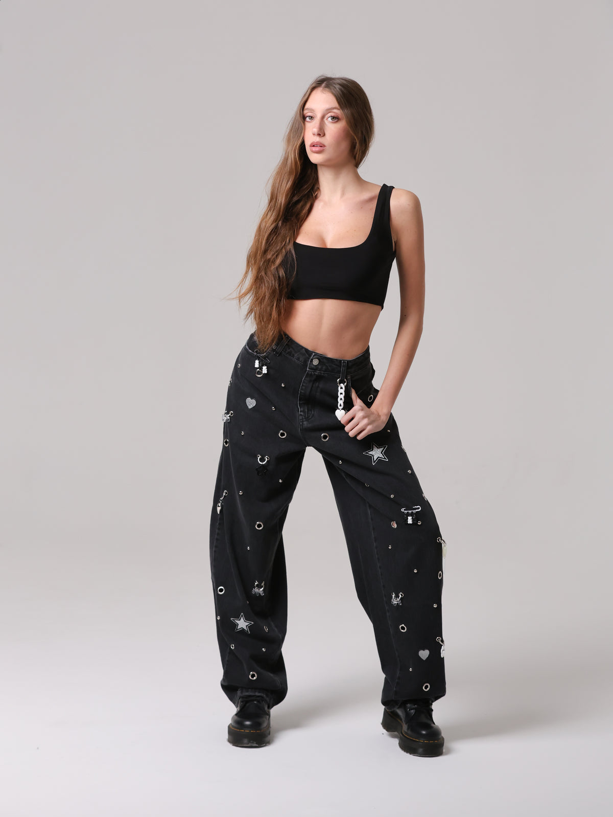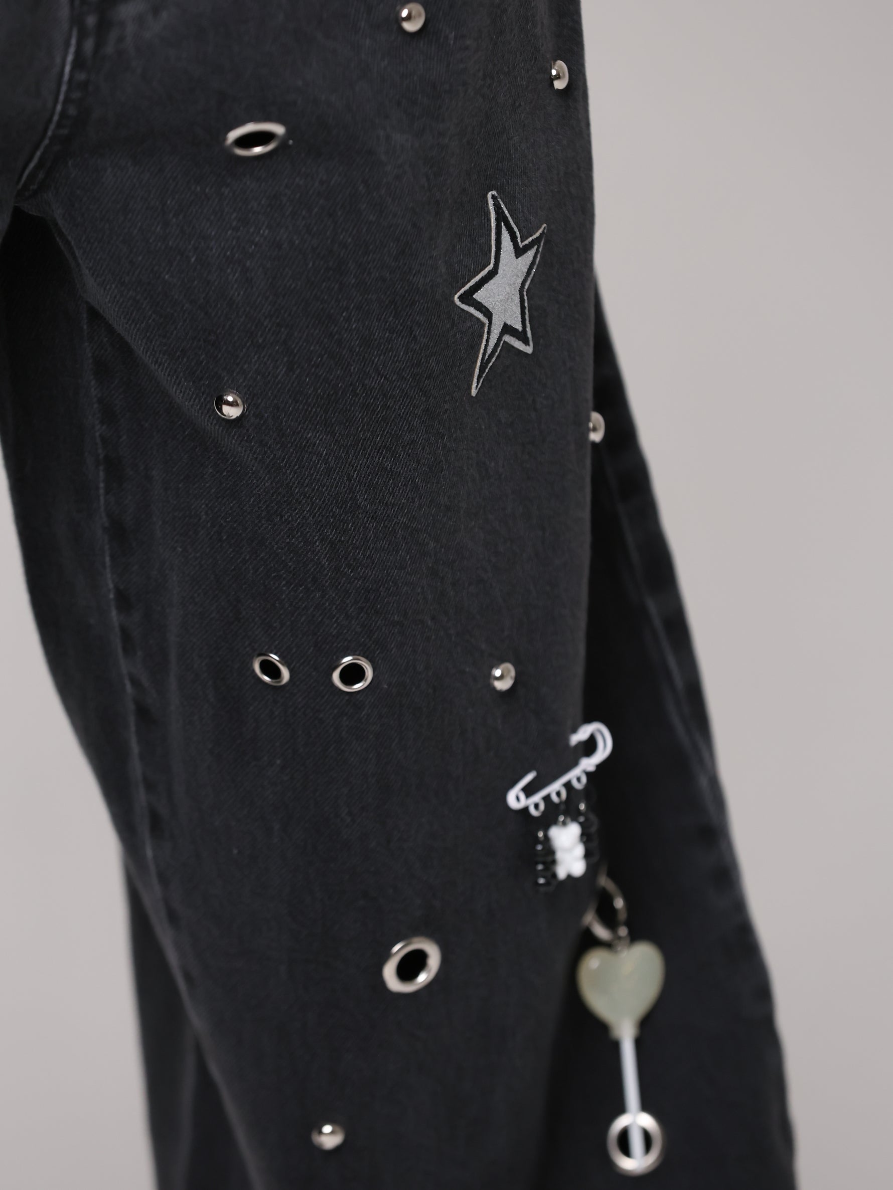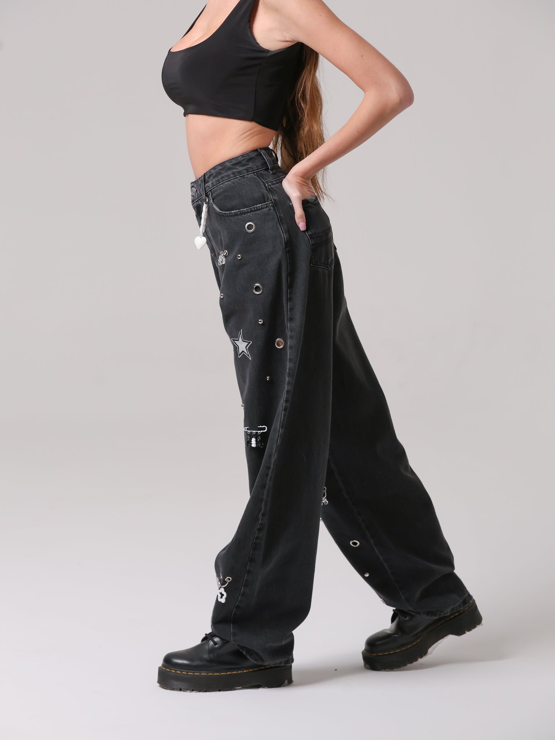 Questo non è un semplice jeans, ma un capo che non ha eguali: un mix di borchie, occhielli e charms anima la superficie, trasformando il capo in un'espressione giocosa di stile contemporaneo. Un vero statement di personalità e creatività.