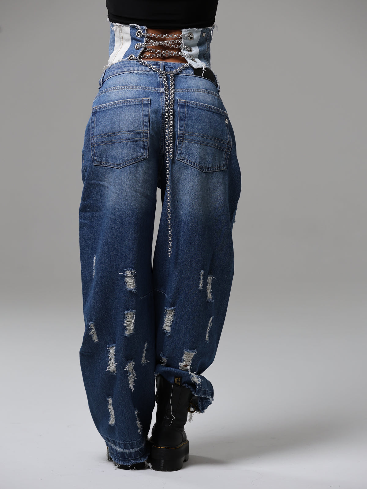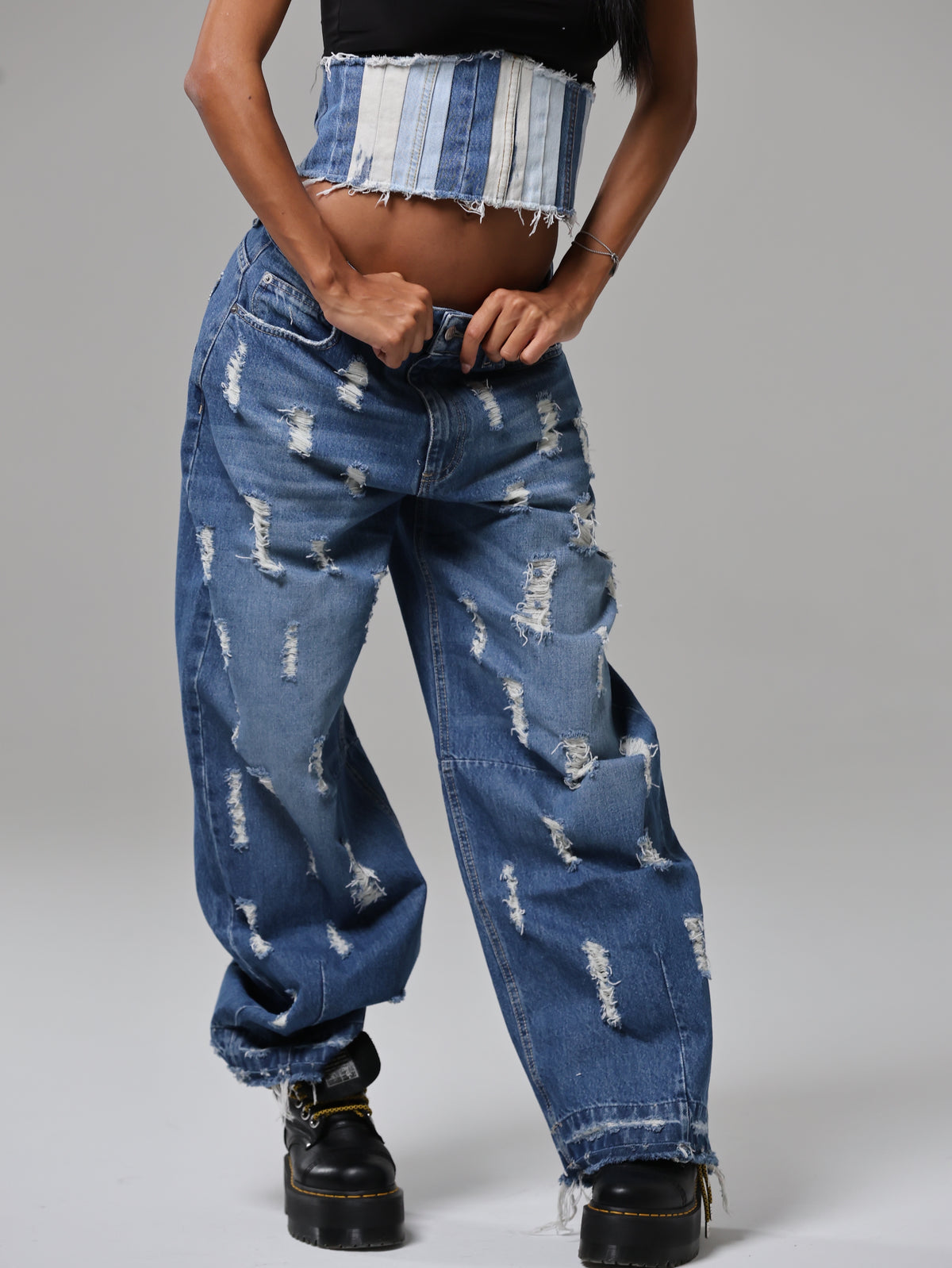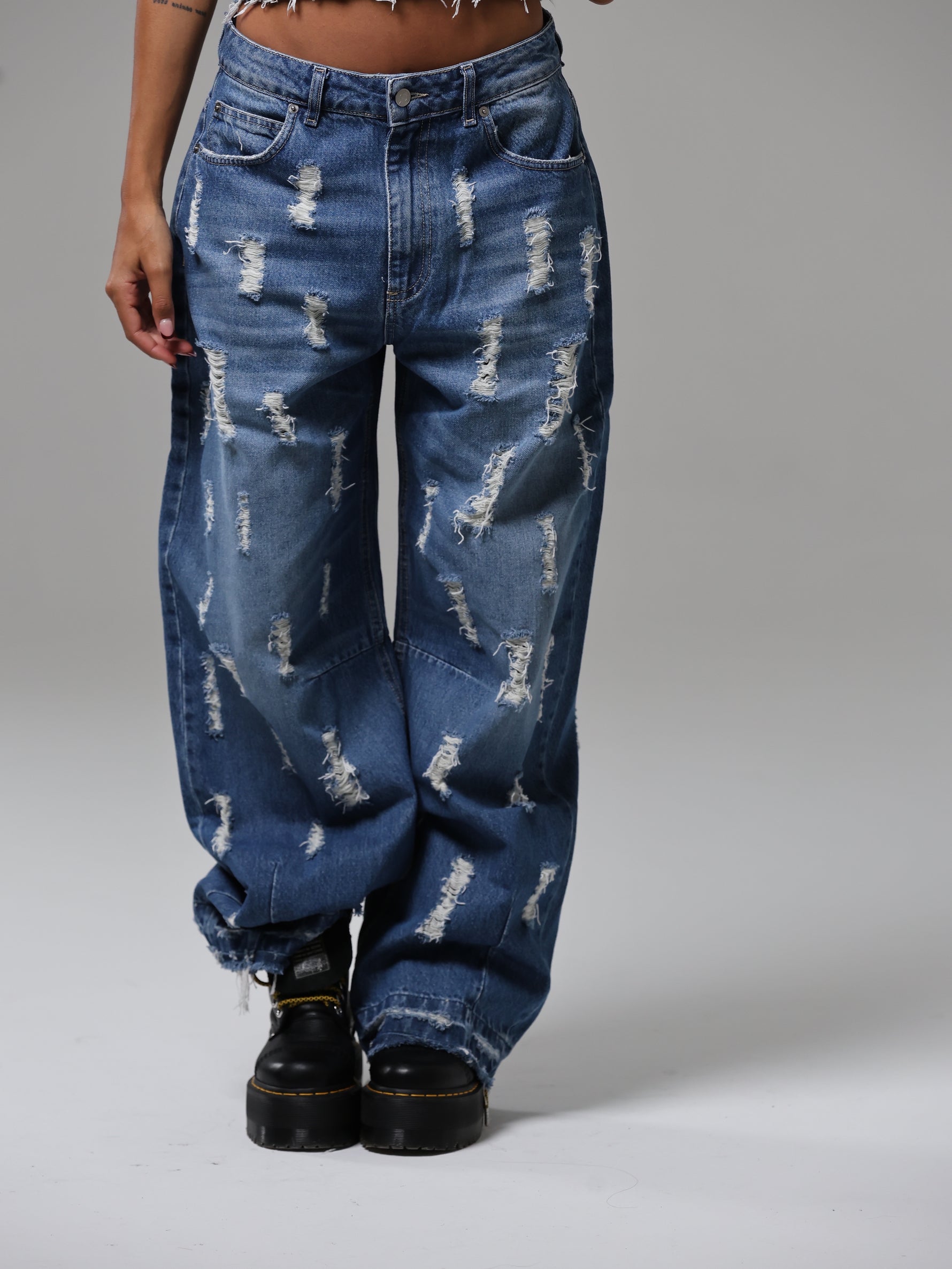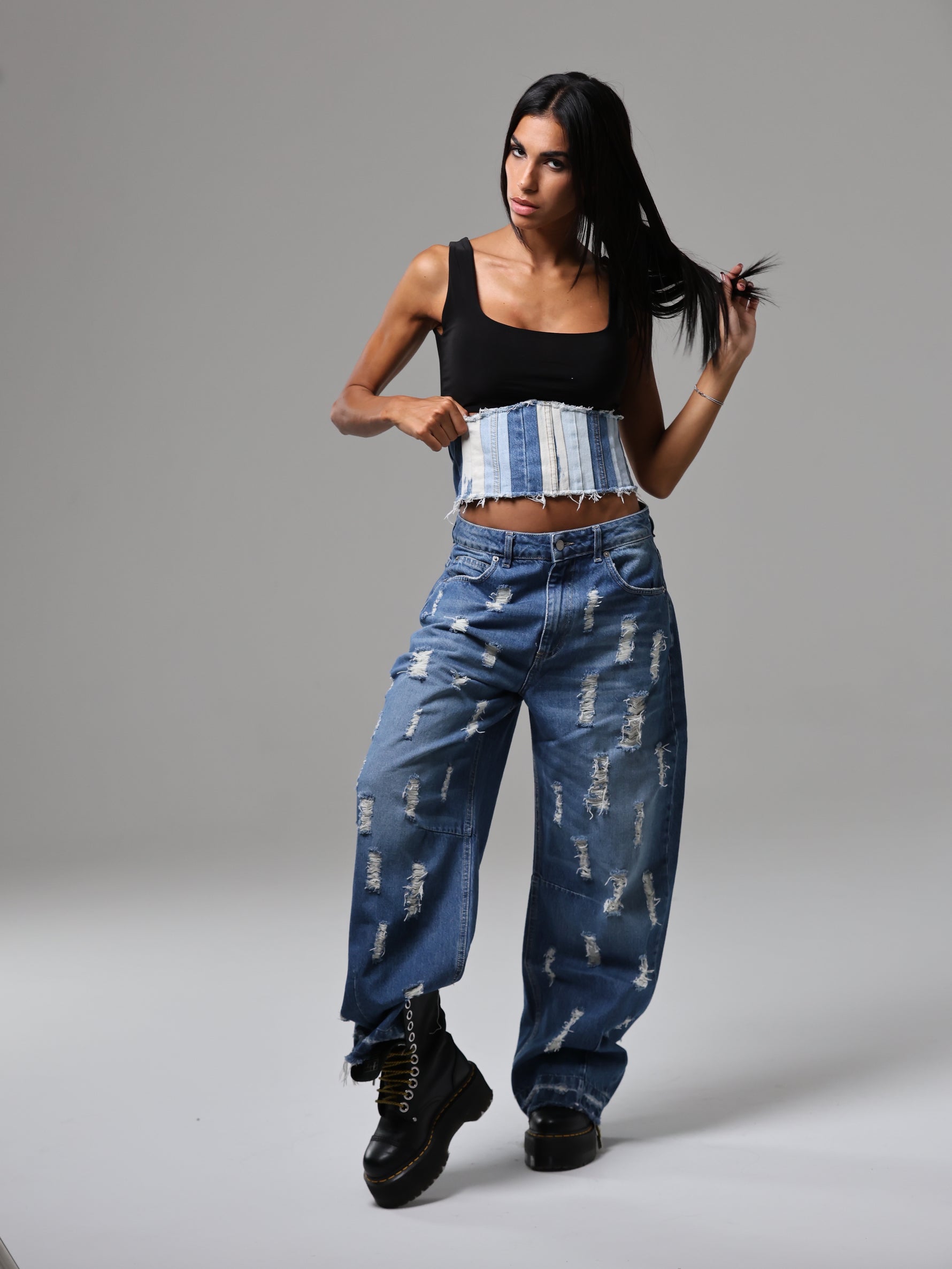 Un gioco di texture e volumi: i tanti piccoli strappi sulla gamba ampia animano la superficie creando un effetto vissuto e dinamico.