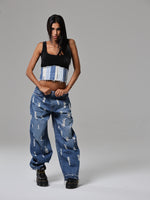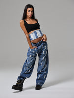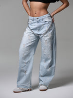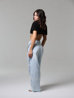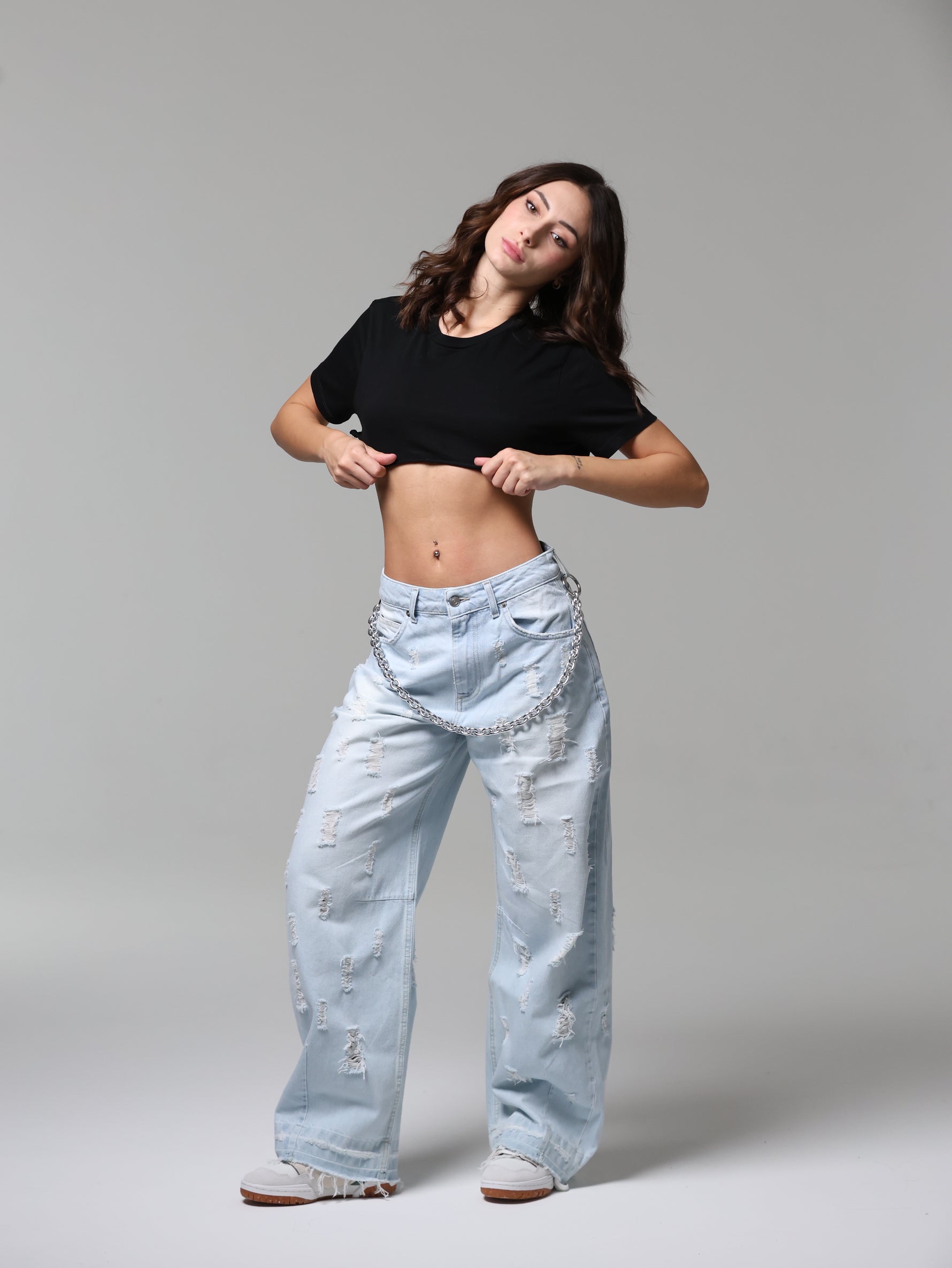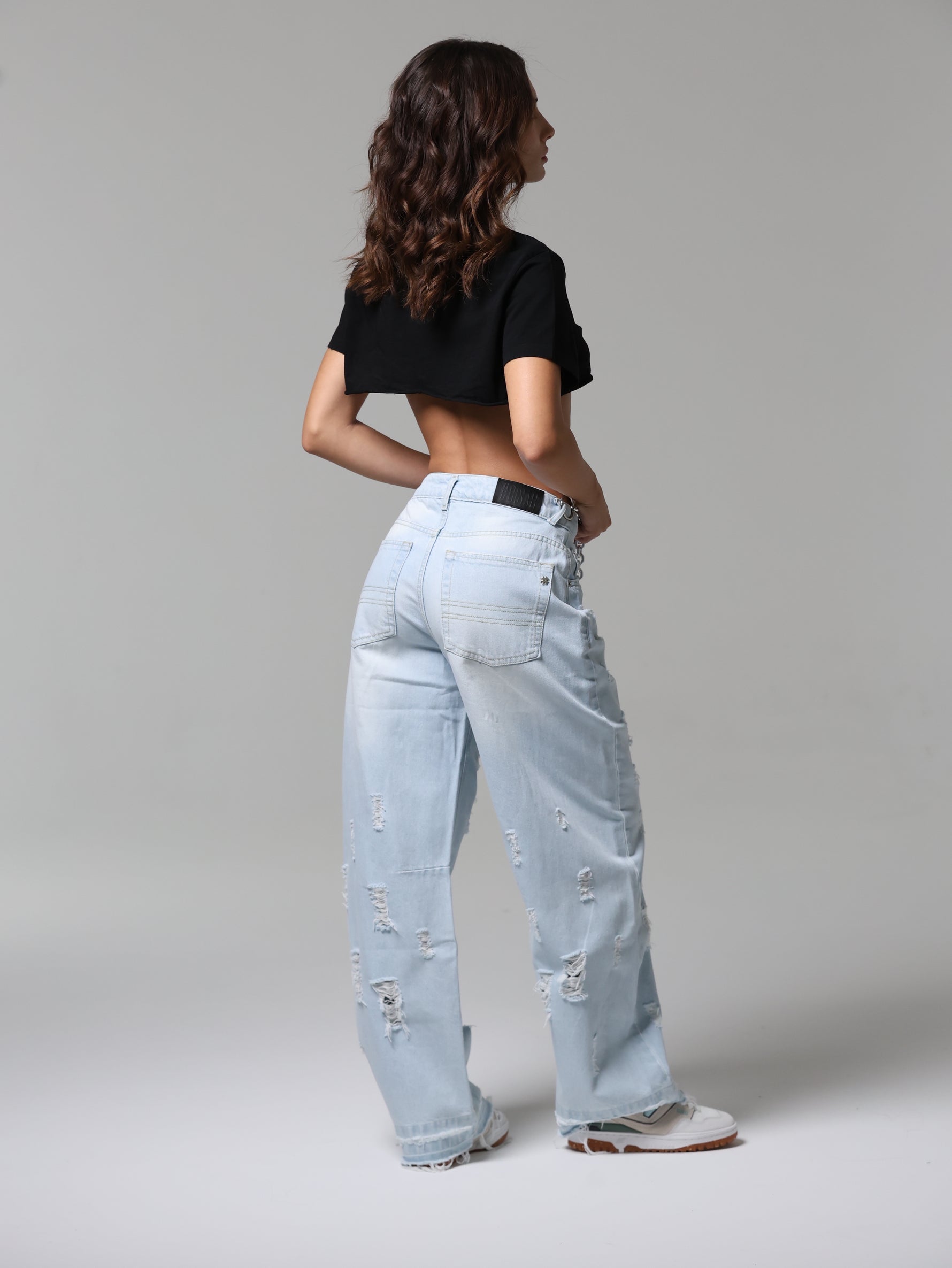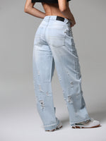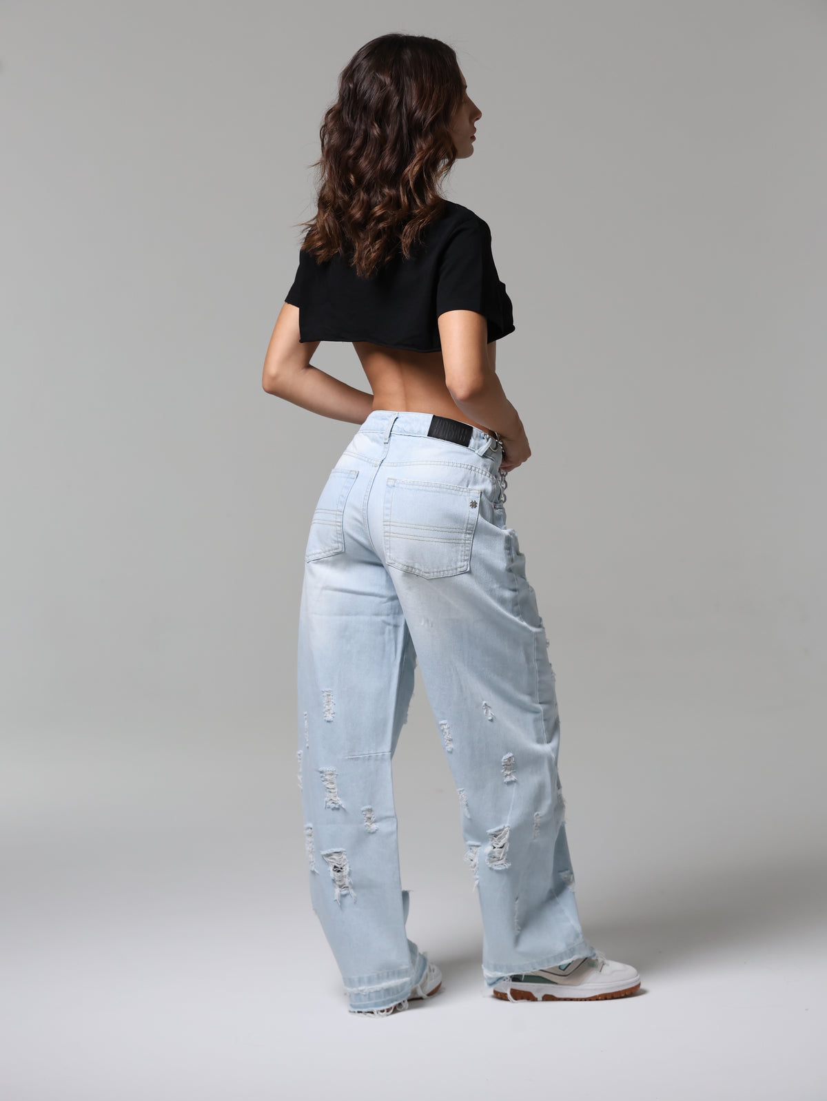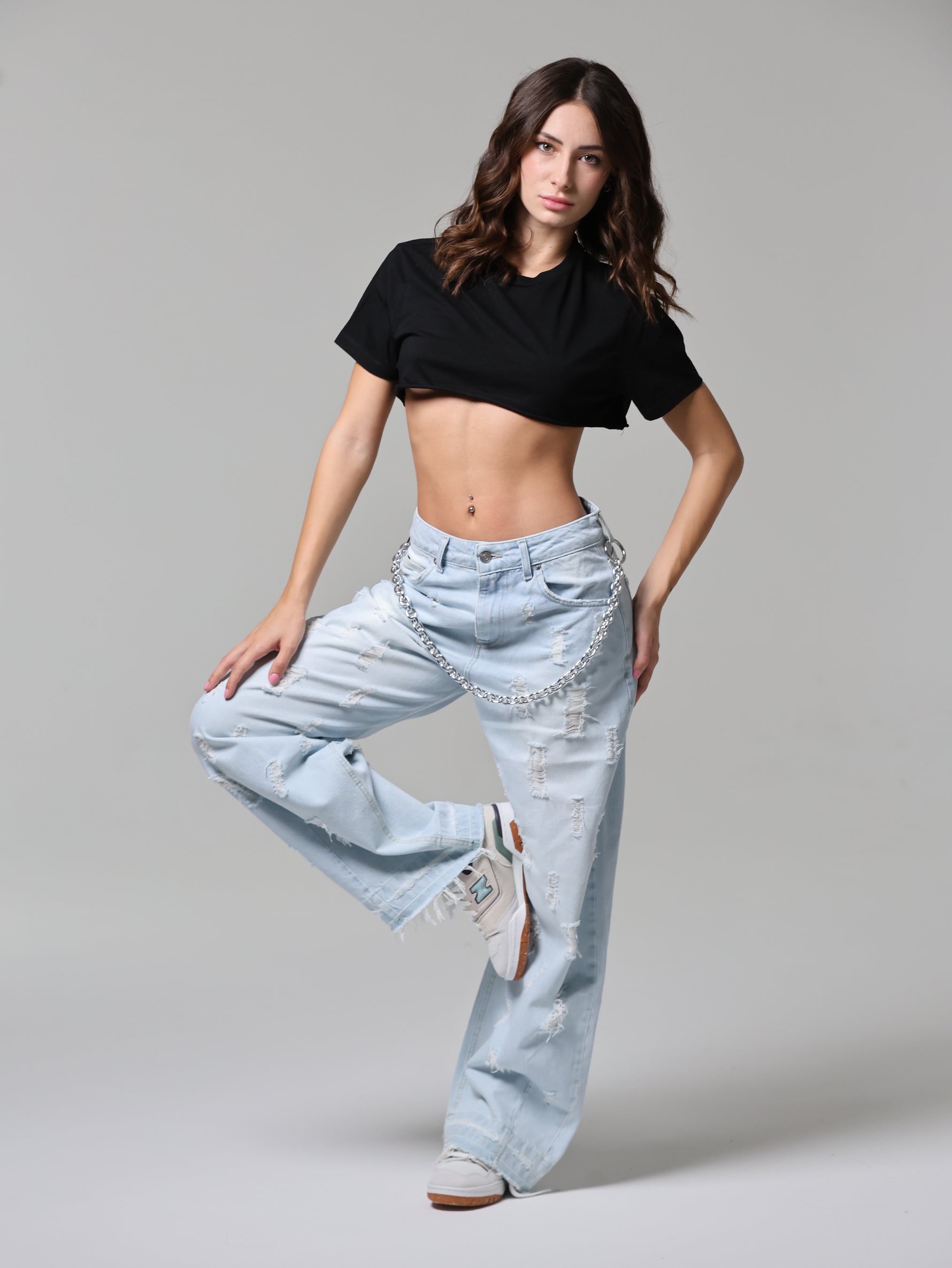 Un gioco di texture e volumi: i tanti piccoli strappi sulla gamba ampia animano la superficie creando un effetto vissuto e dinamico.