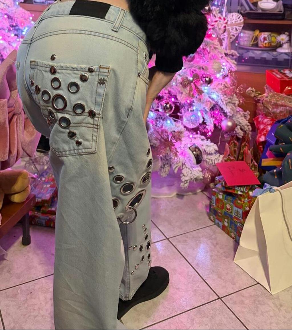 Un jeans che rappresenta a pieno la magia della lavorazione a mano: gli occhielli, disposti come scintille sulla superficie, creano un disegno luminoso ed esplosivo che rompe la monotonia del denim e lo trasformano in un capo che non si limita a vestire, ma a brillare.