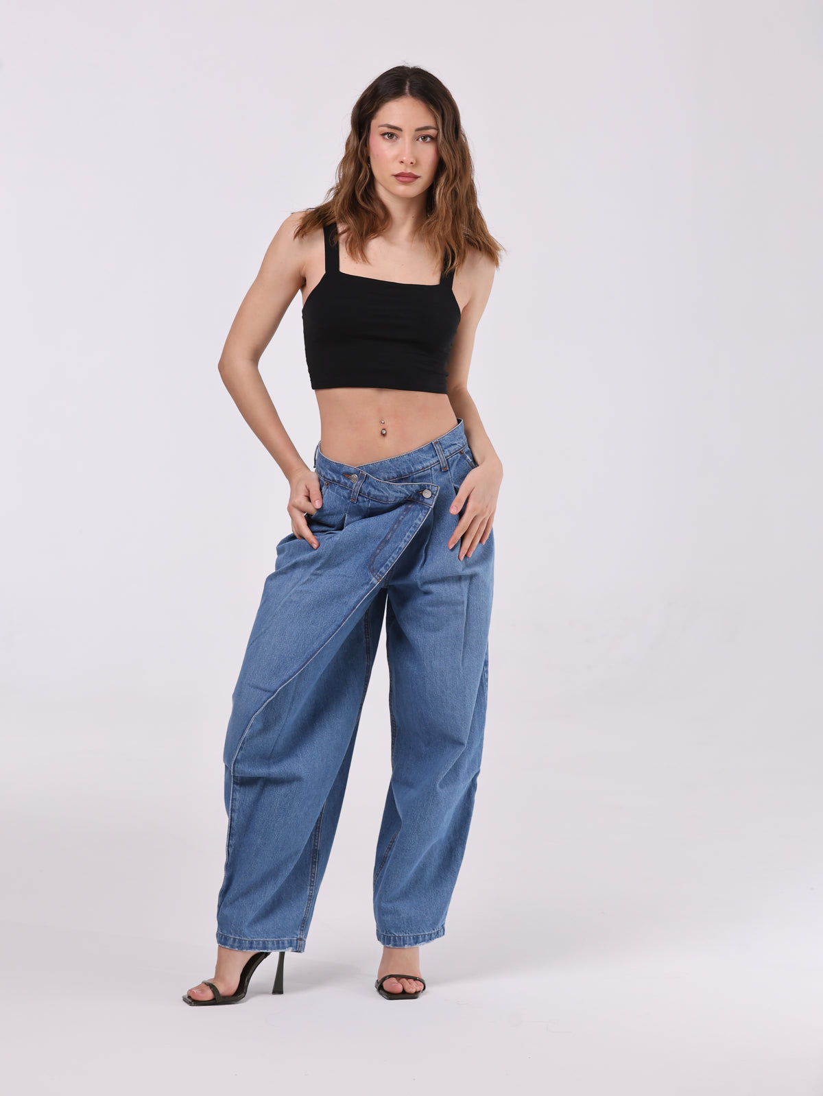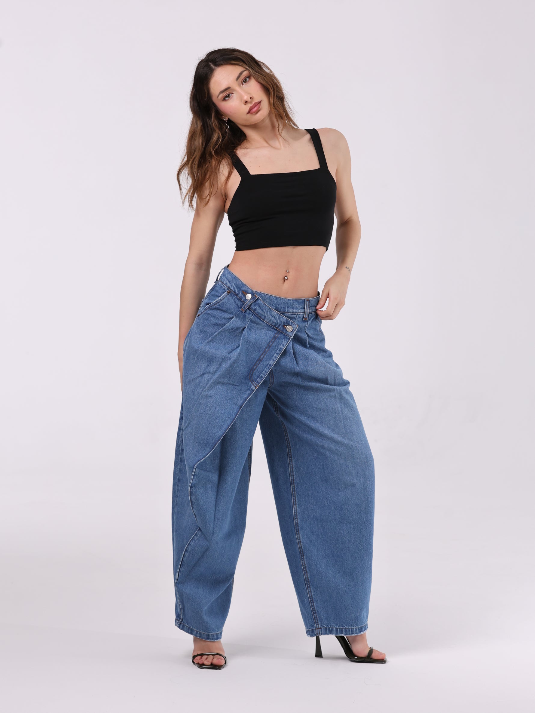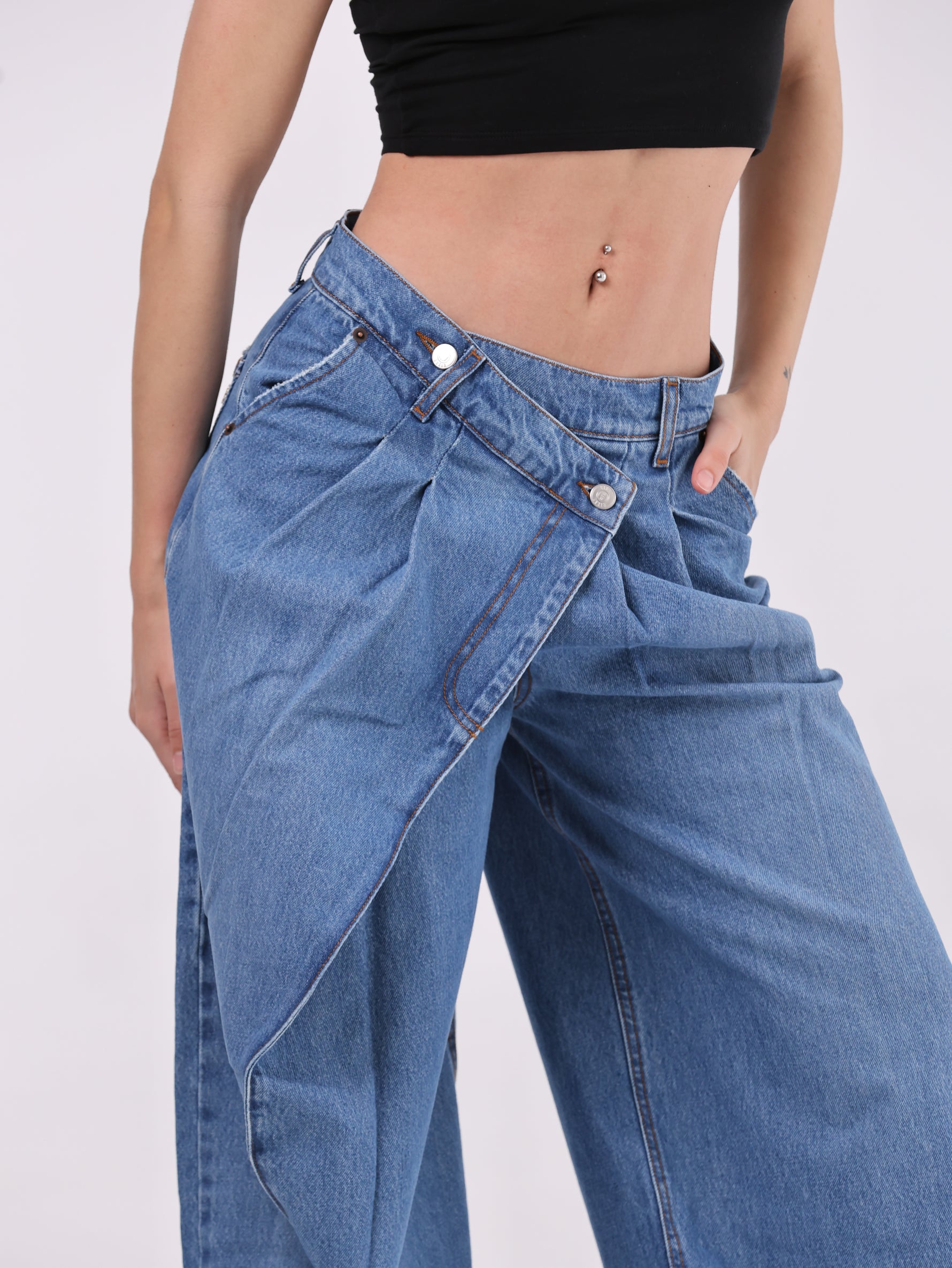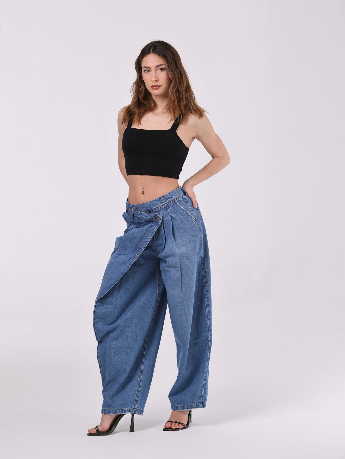 Un jeans crossover come non lo avete mai visto, con una struttura frontale che si sovrappone creando un effetto quasi a pareo, che cade morbido e ridisegna il movimento del jeans. La silhouette cambia, si apre, si muove con il passo.