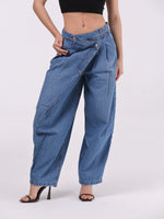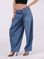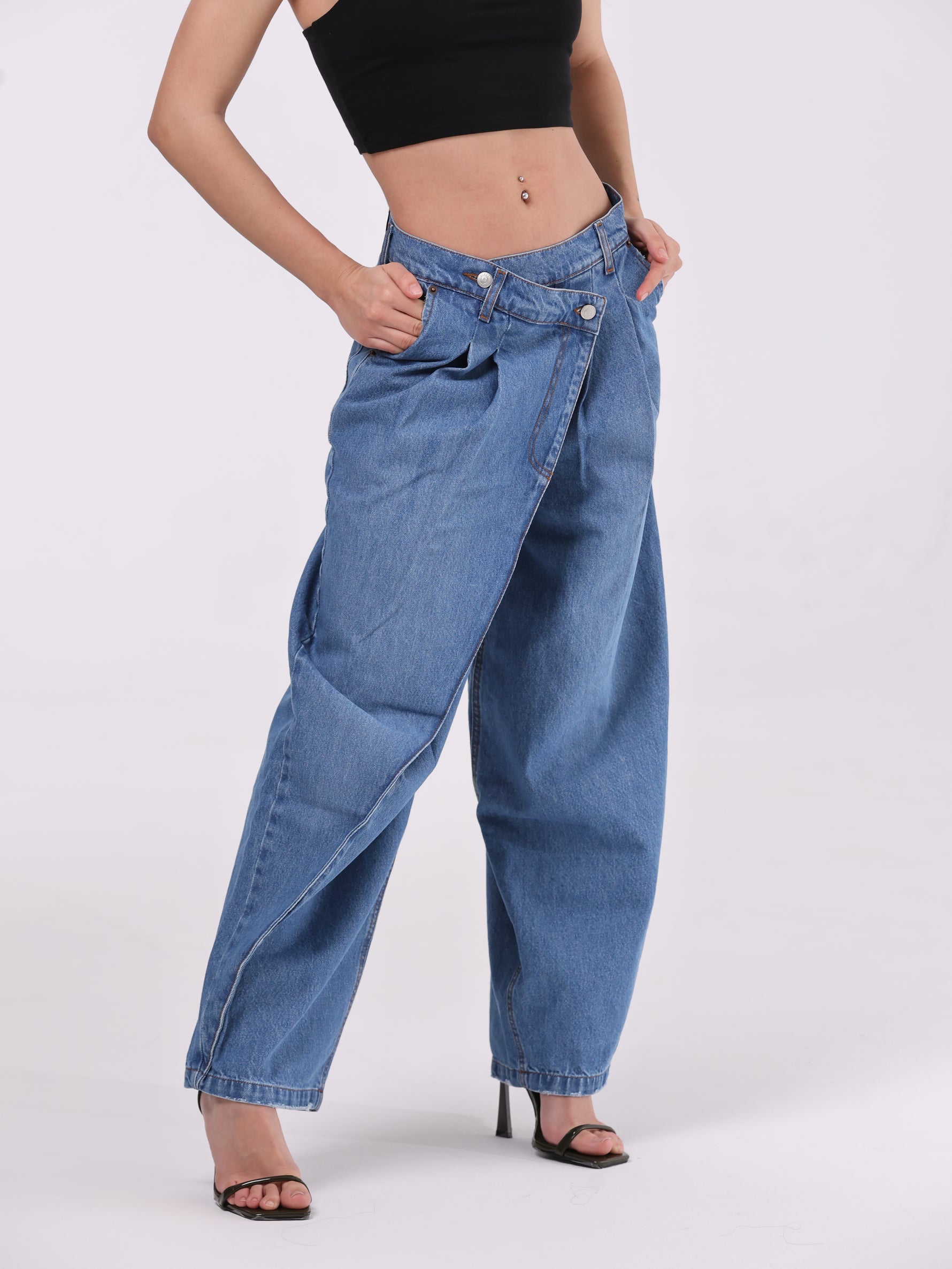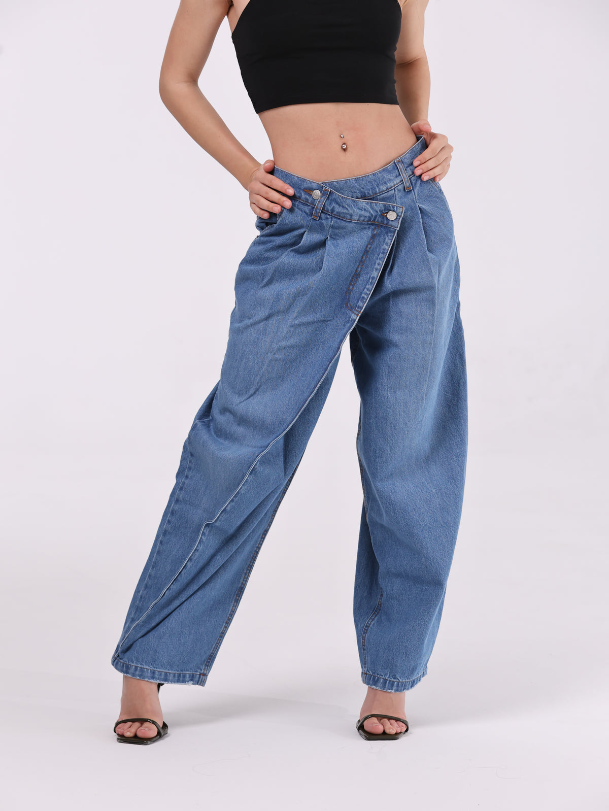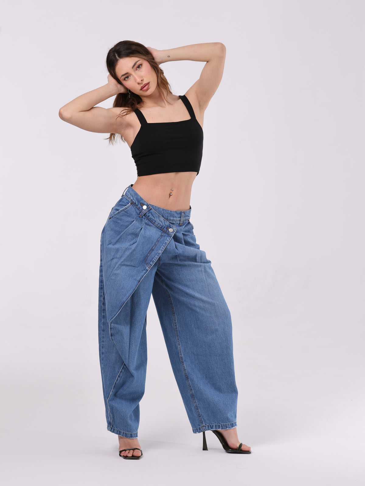 Un jeans crossover come non lo avete mai visto, con una struttura frontale che si sovrappone creando un effetto quasi a pareo, che cade morbido e ridisegna il movimento del jeans. La silhouette cambia, si apre, si muove con il passo.