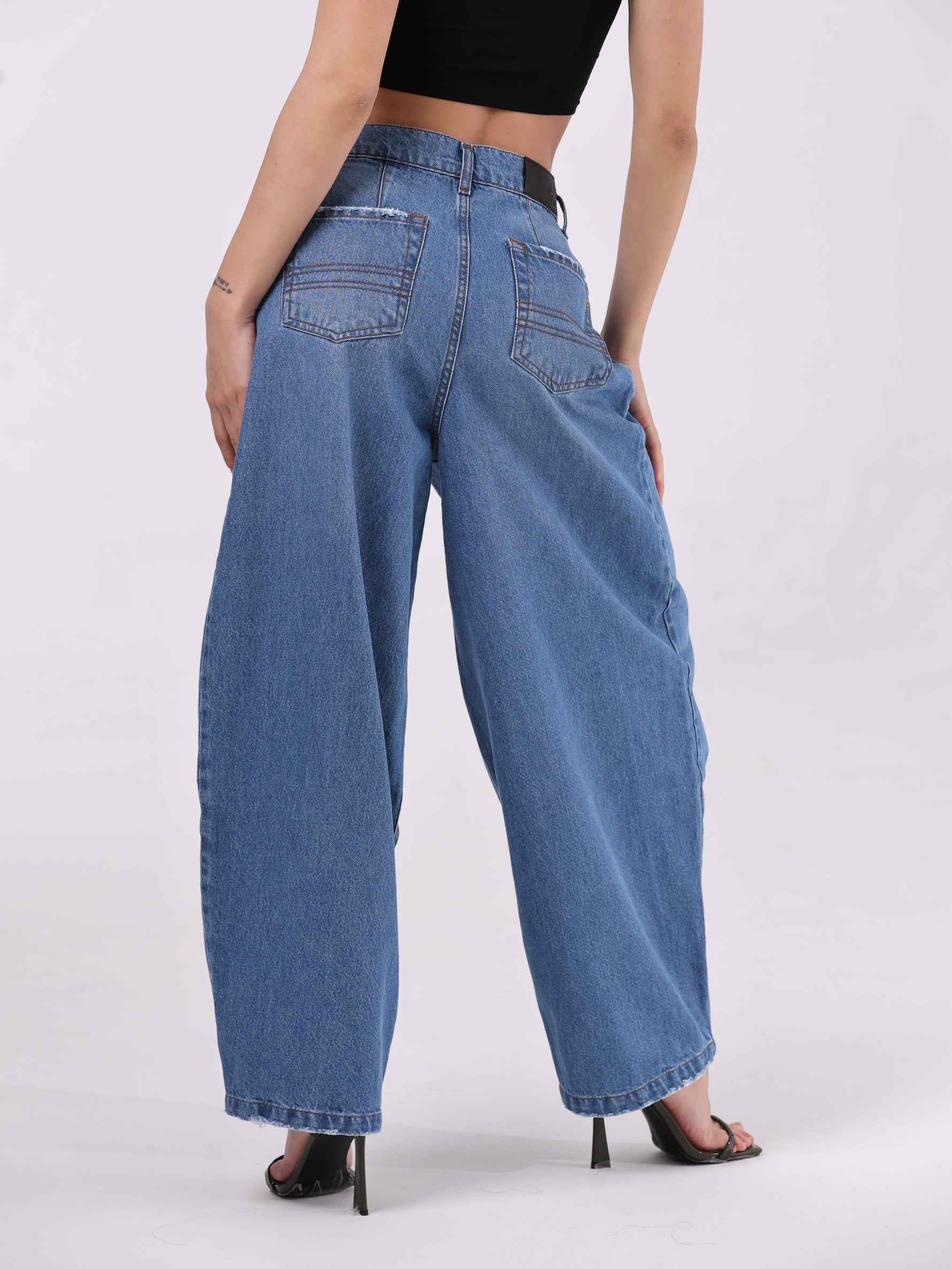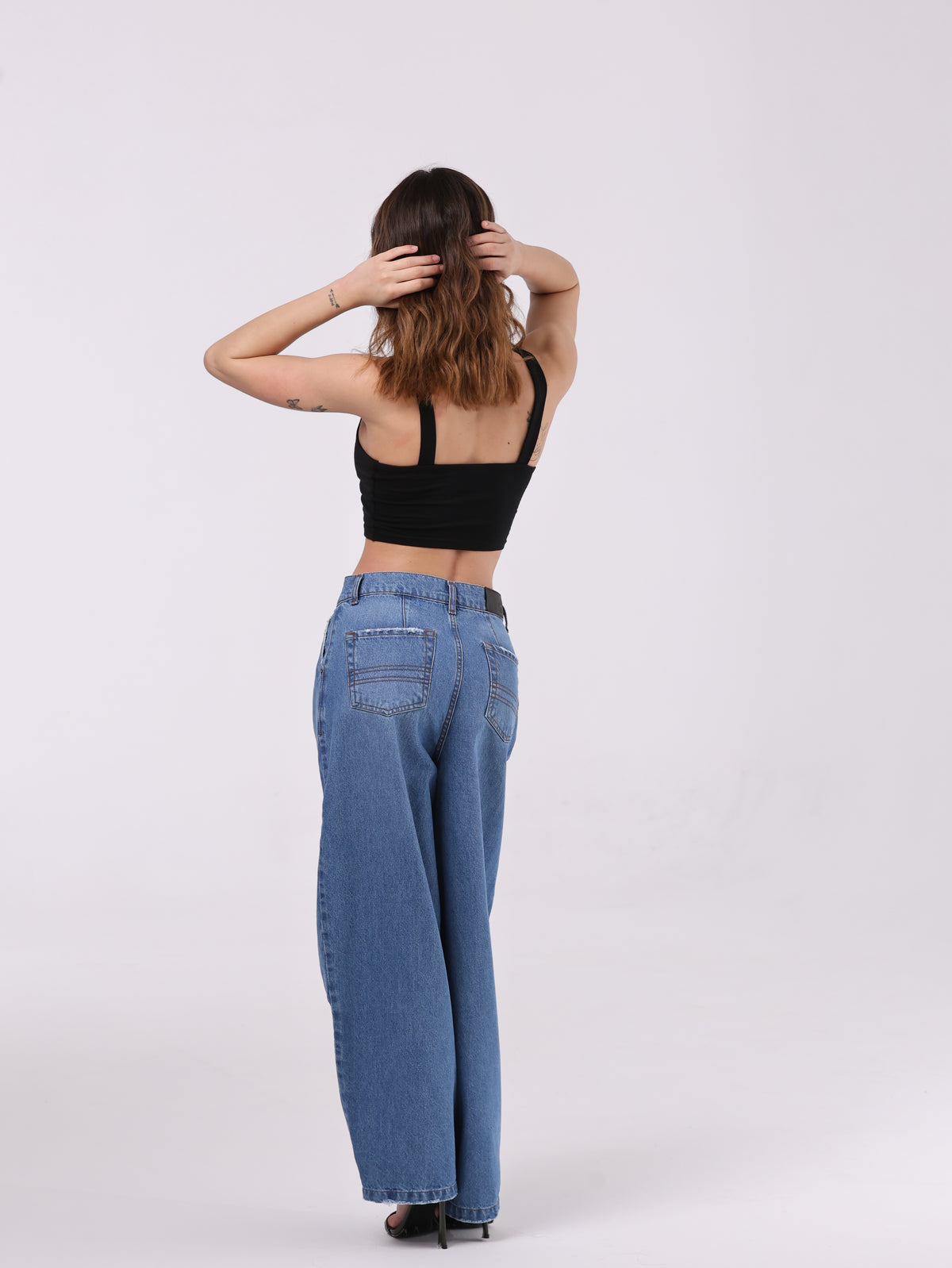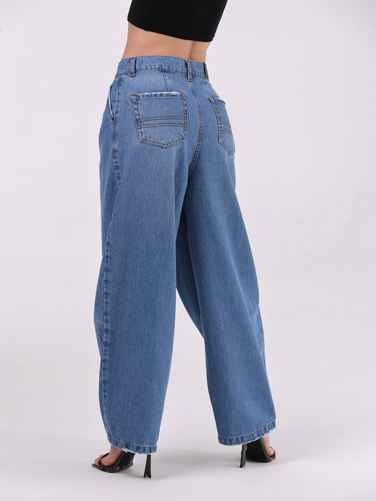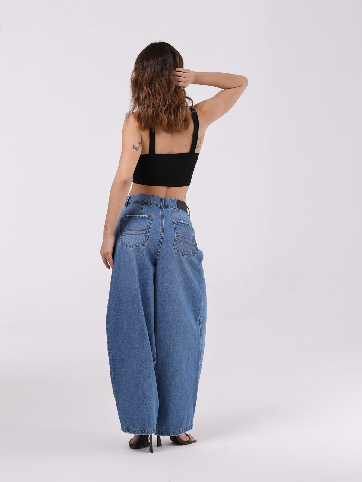 Un jeans crossover come non lo avete mai visto, con una struttura frontale che si sovrappone creando un effetto quasi a pareo, che cade morbido e ridisegna il movimento del jeans. La silhouette cambia, si apre, si muove con il passo.