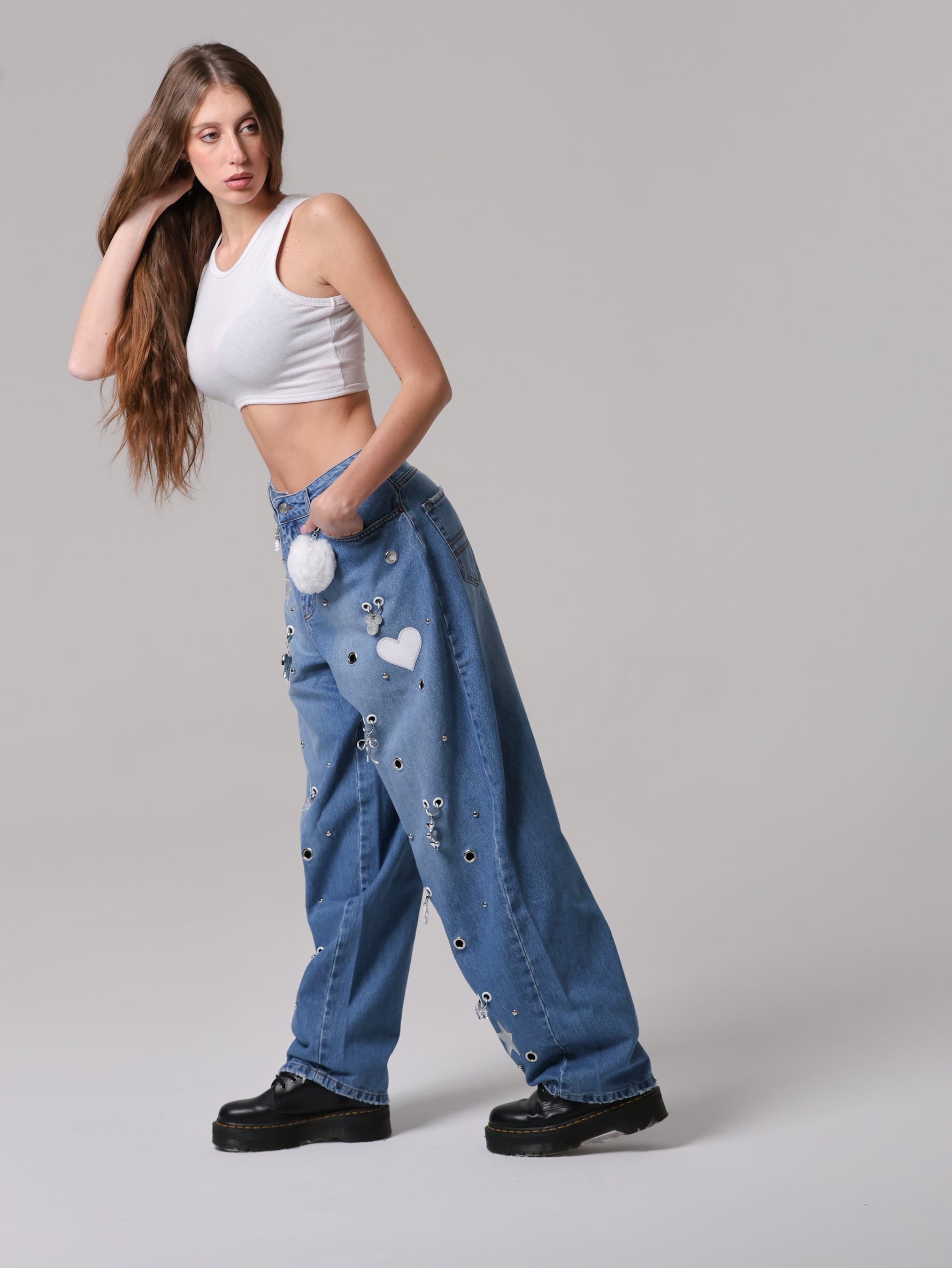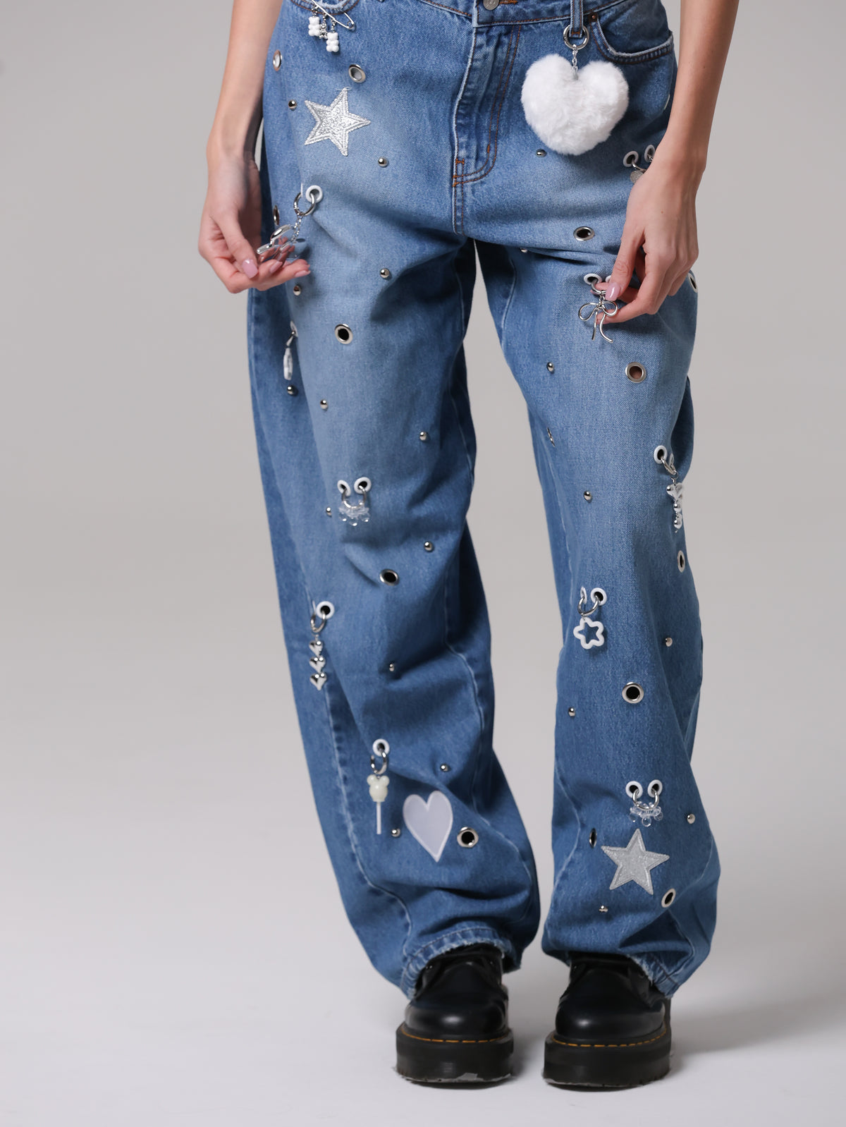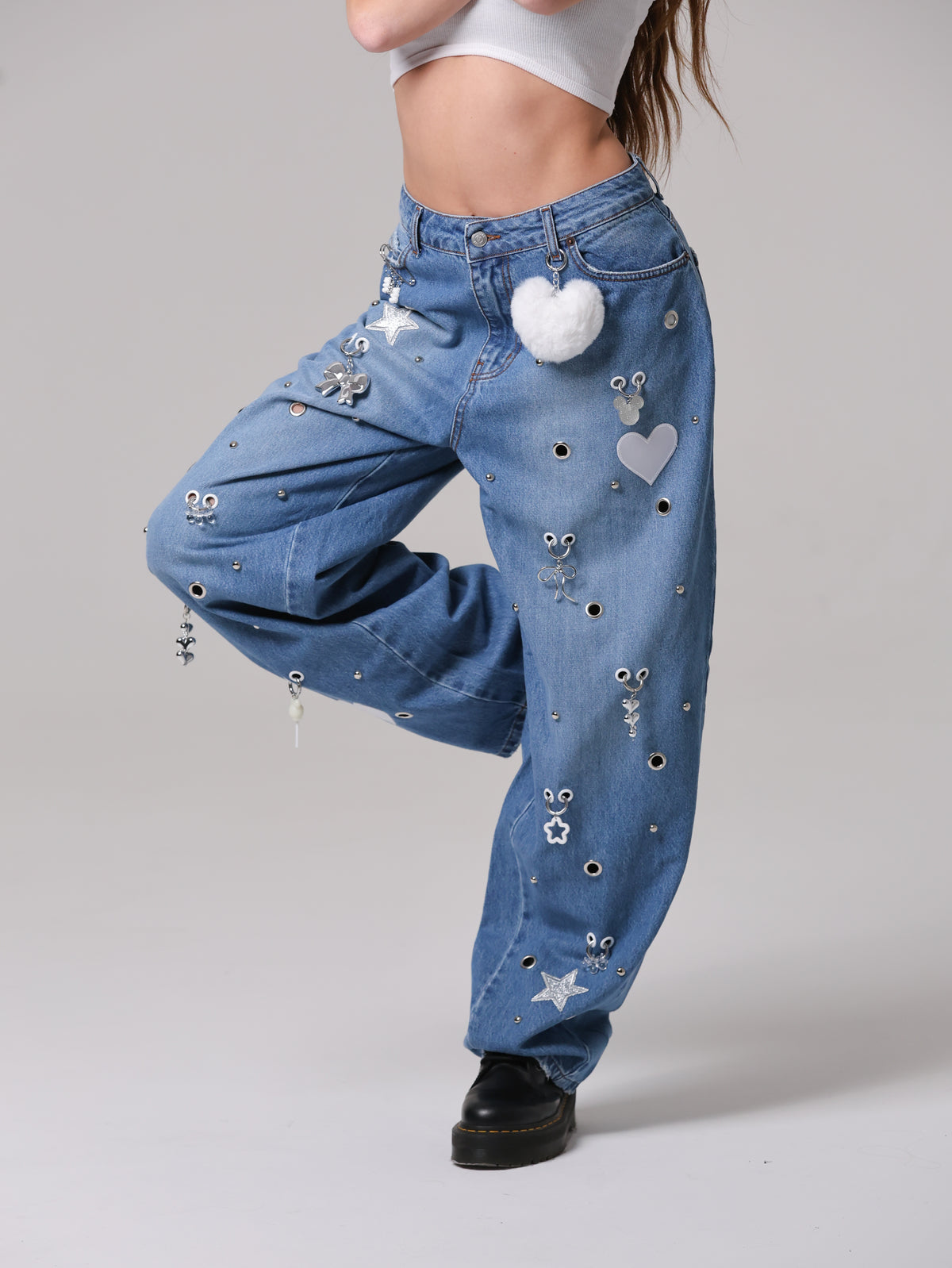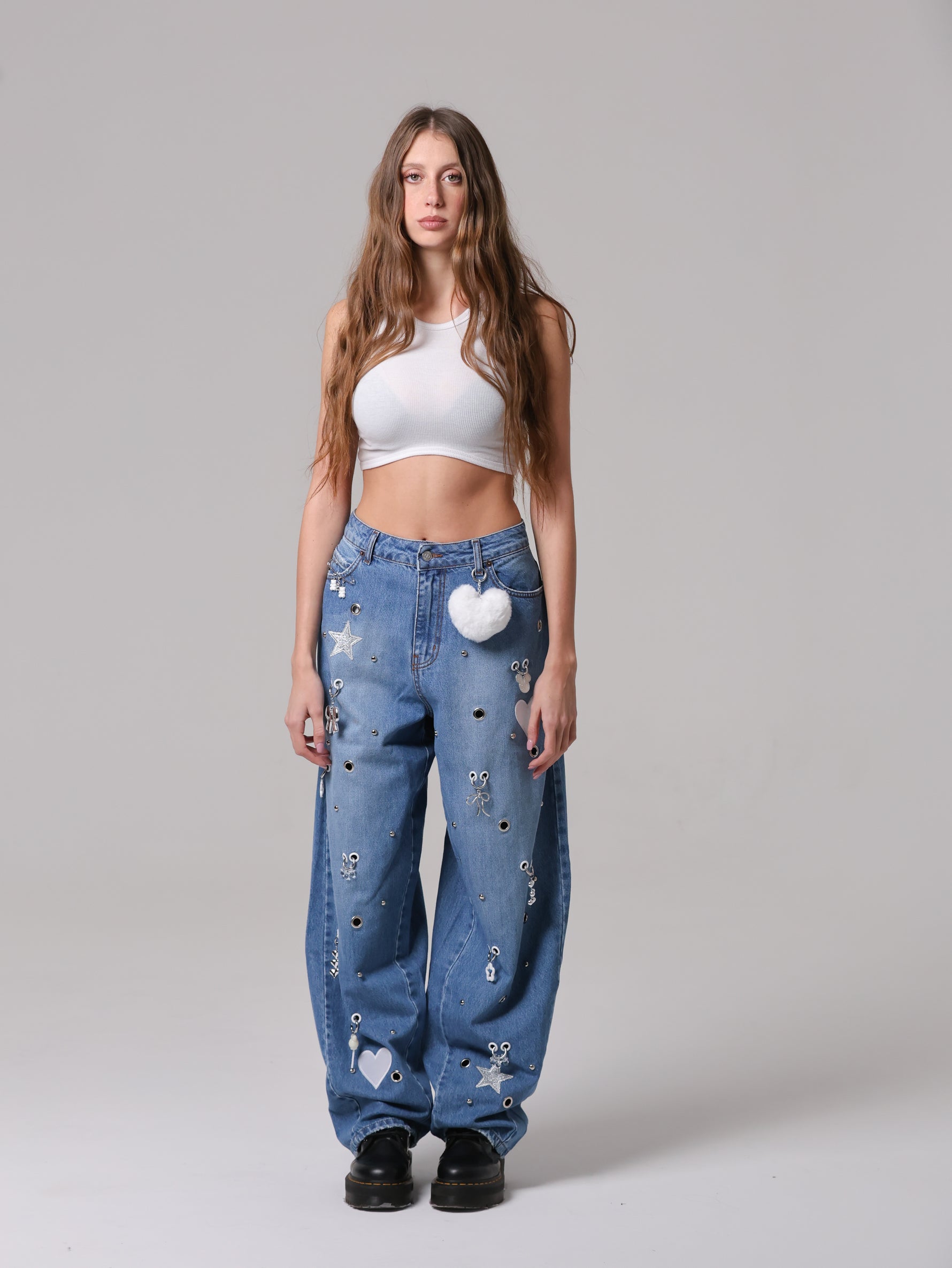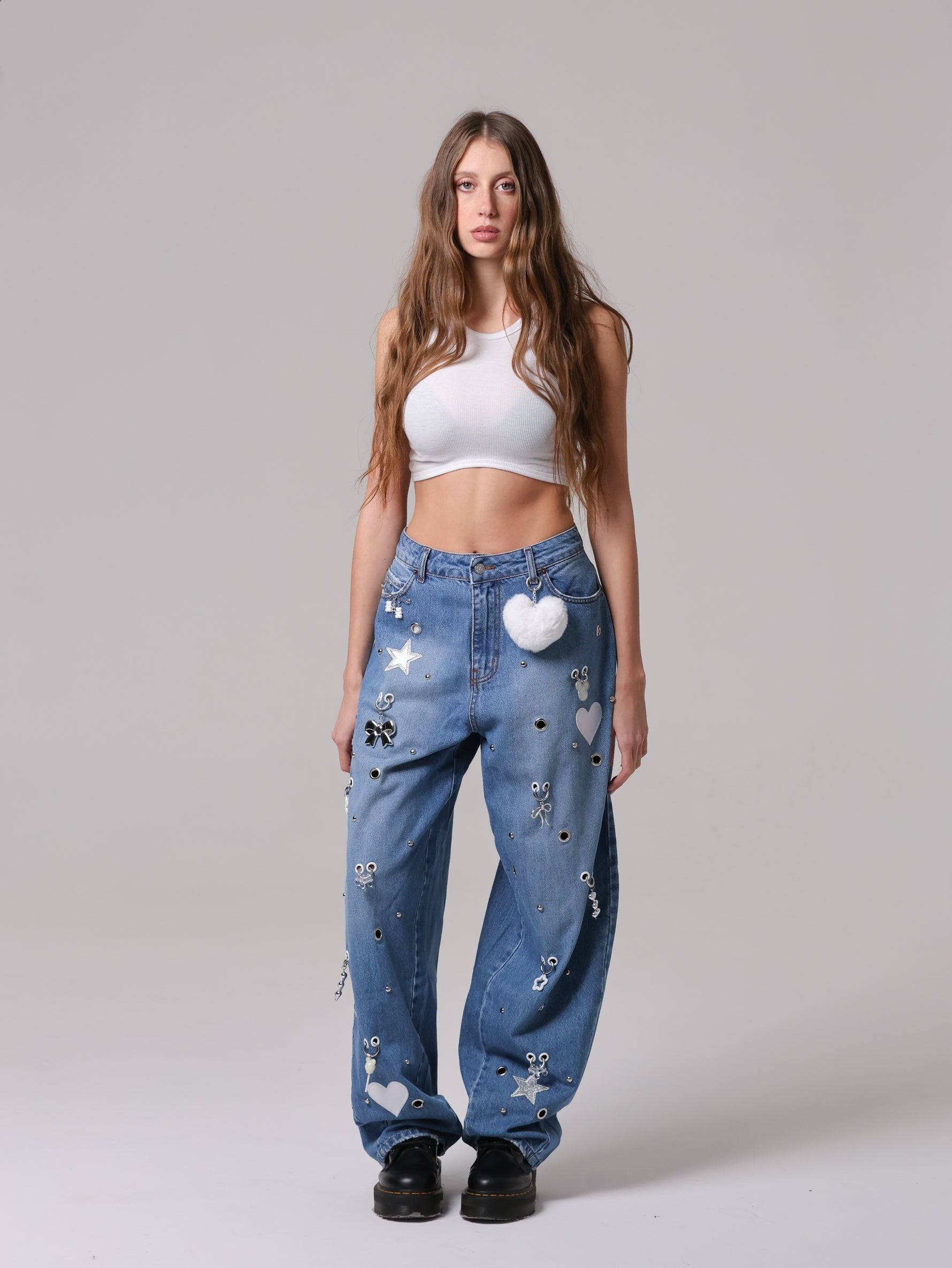 Questo non è un semplice jeans, ma un capo che non ha eguali: un mix di borchie, occhielli e charms anima la superficie, trasformando il capo in un'espressione giocosa di stile contemporaneo. Un vero statement di personalità e creatività.