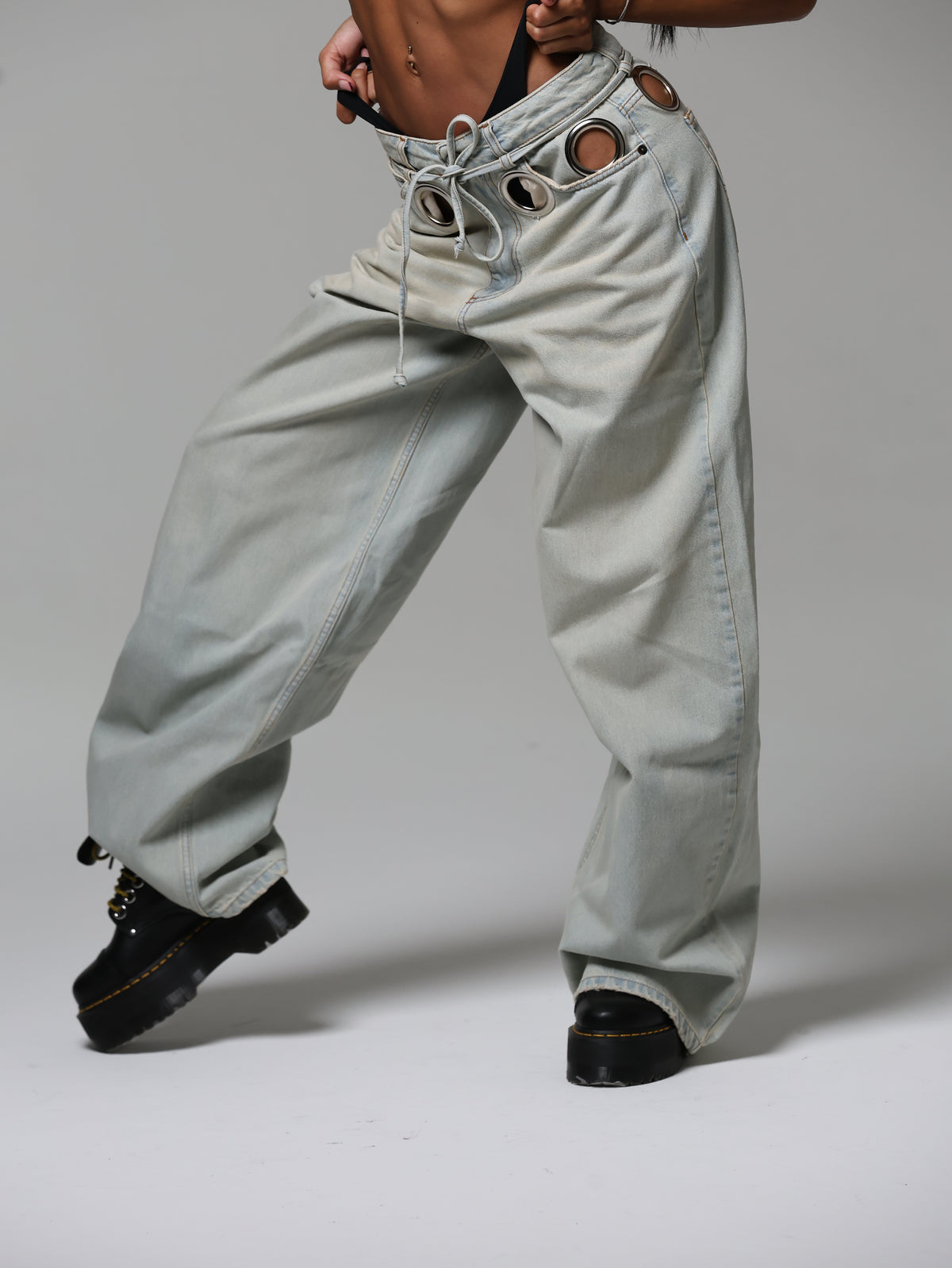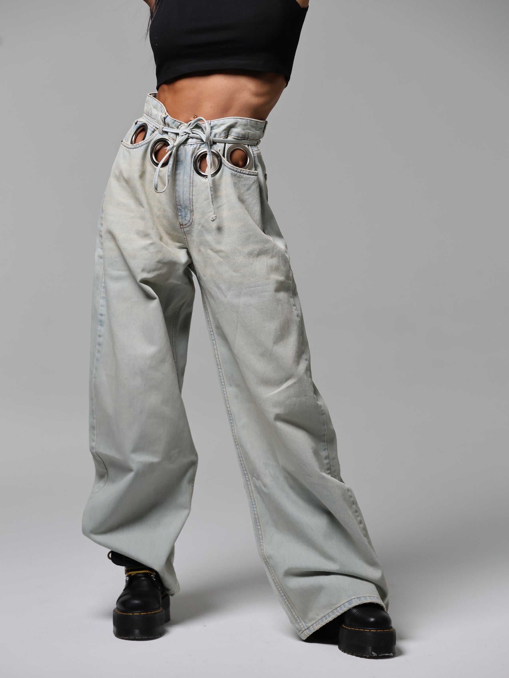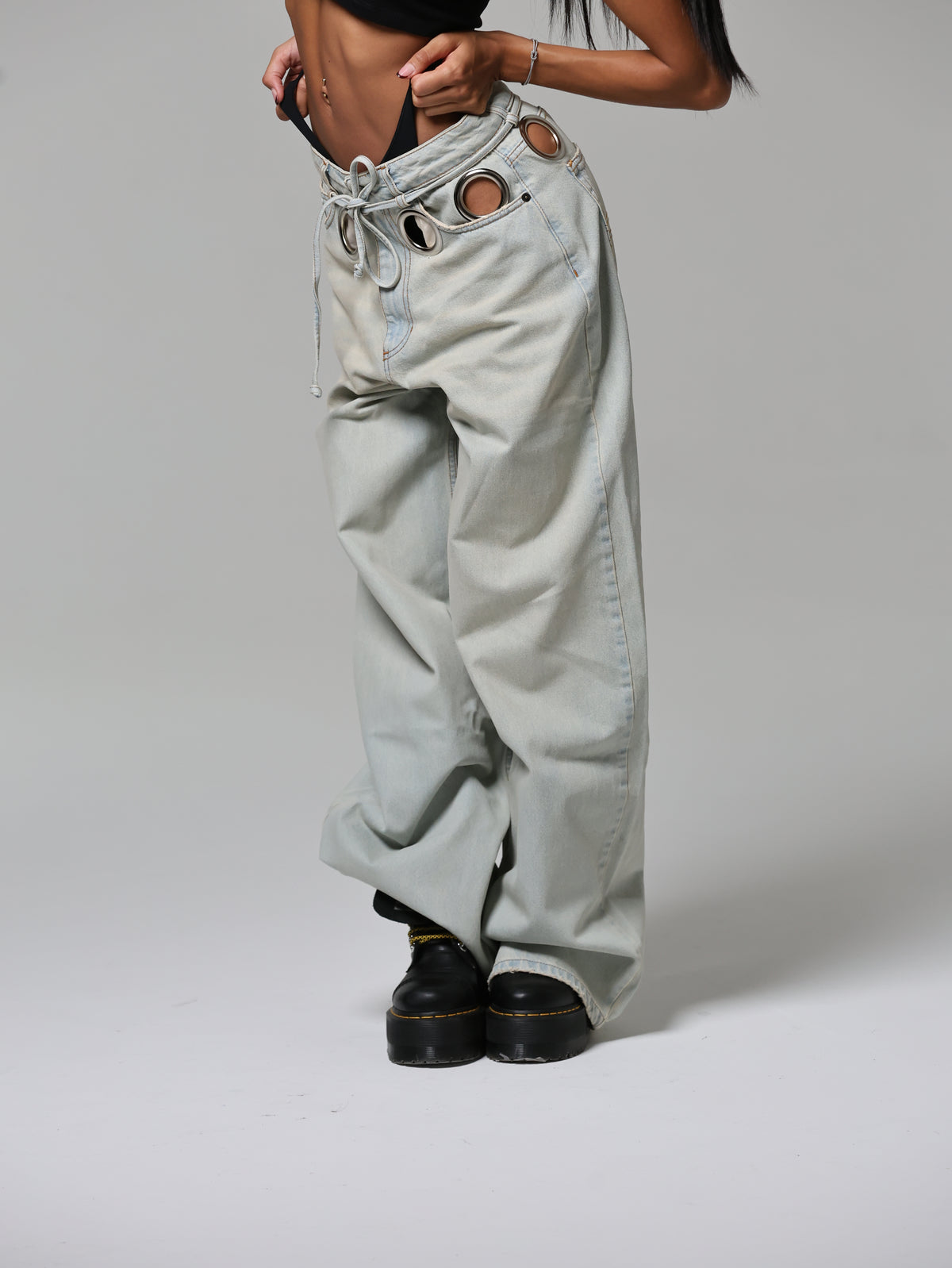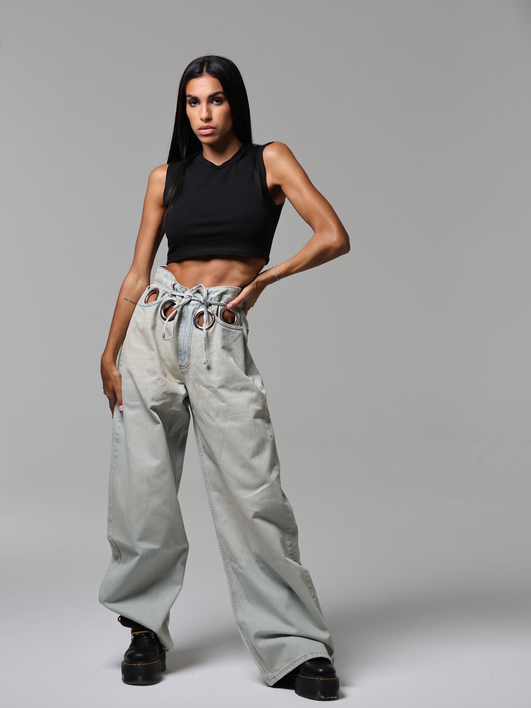 Un jeans che cattura subito lo sguardo grazie agli occhielli oversize che abbracciano la vita. Audace e magnetico, questo capo diventa subito il pezzo chiave di ogni outfit.