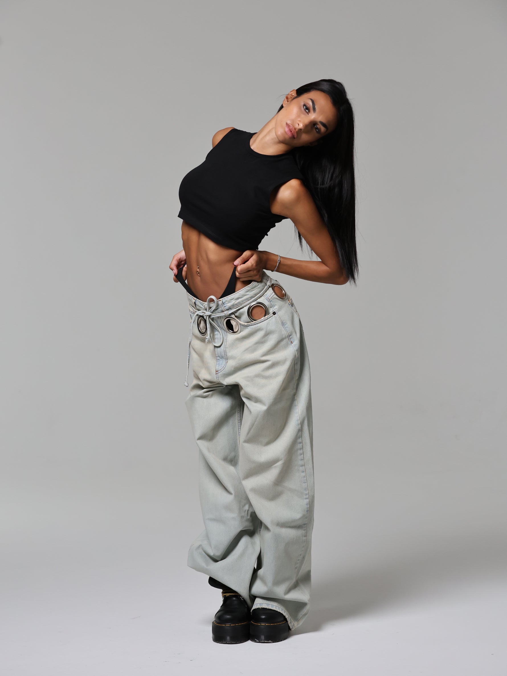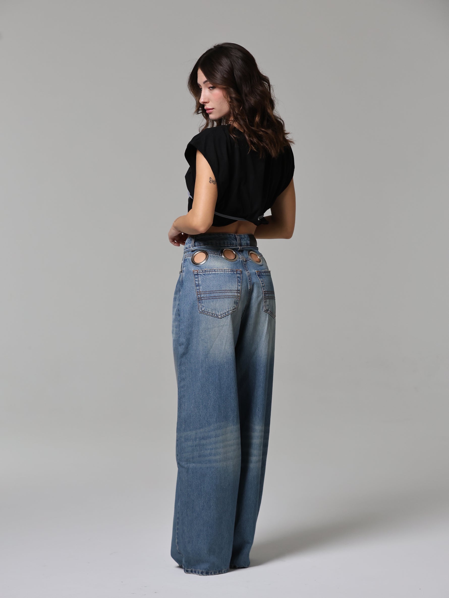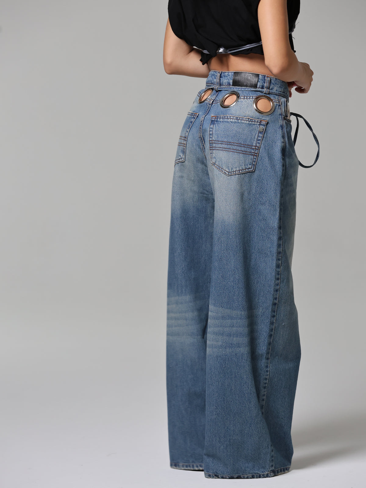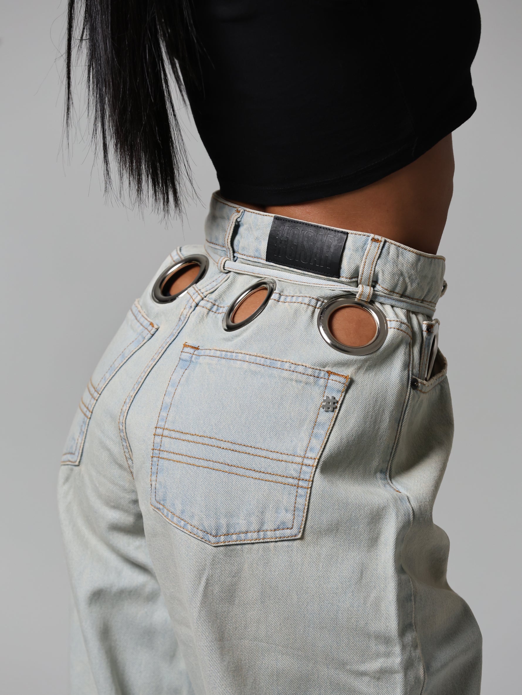 Un jeans che cattura subito lo sguardo grazie agli occhielli oversize che abbracciano la vita. Audace e magnetico, questo capo diventa subito il pezzo chiave di ogni outfit.