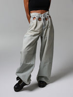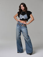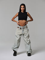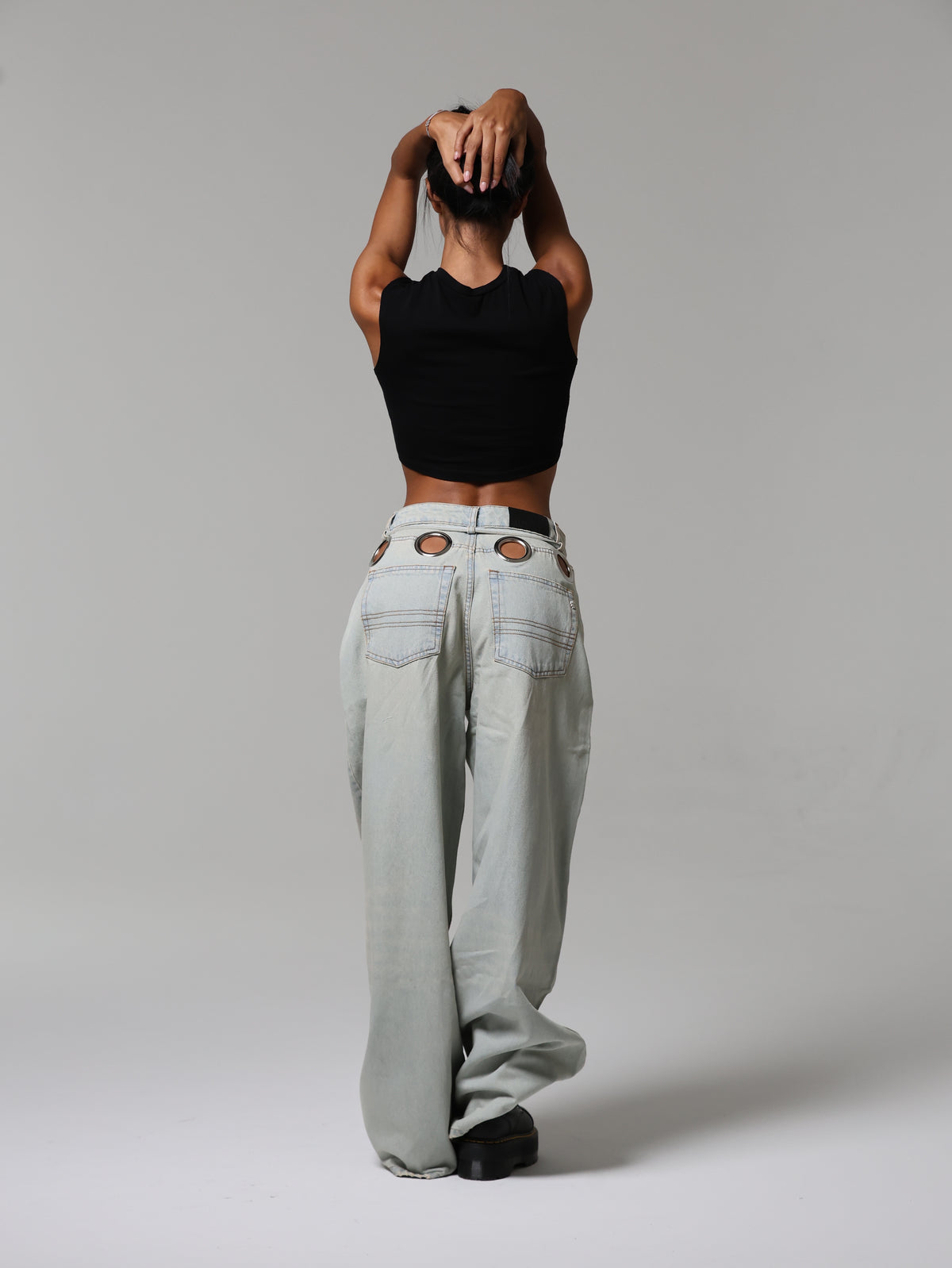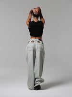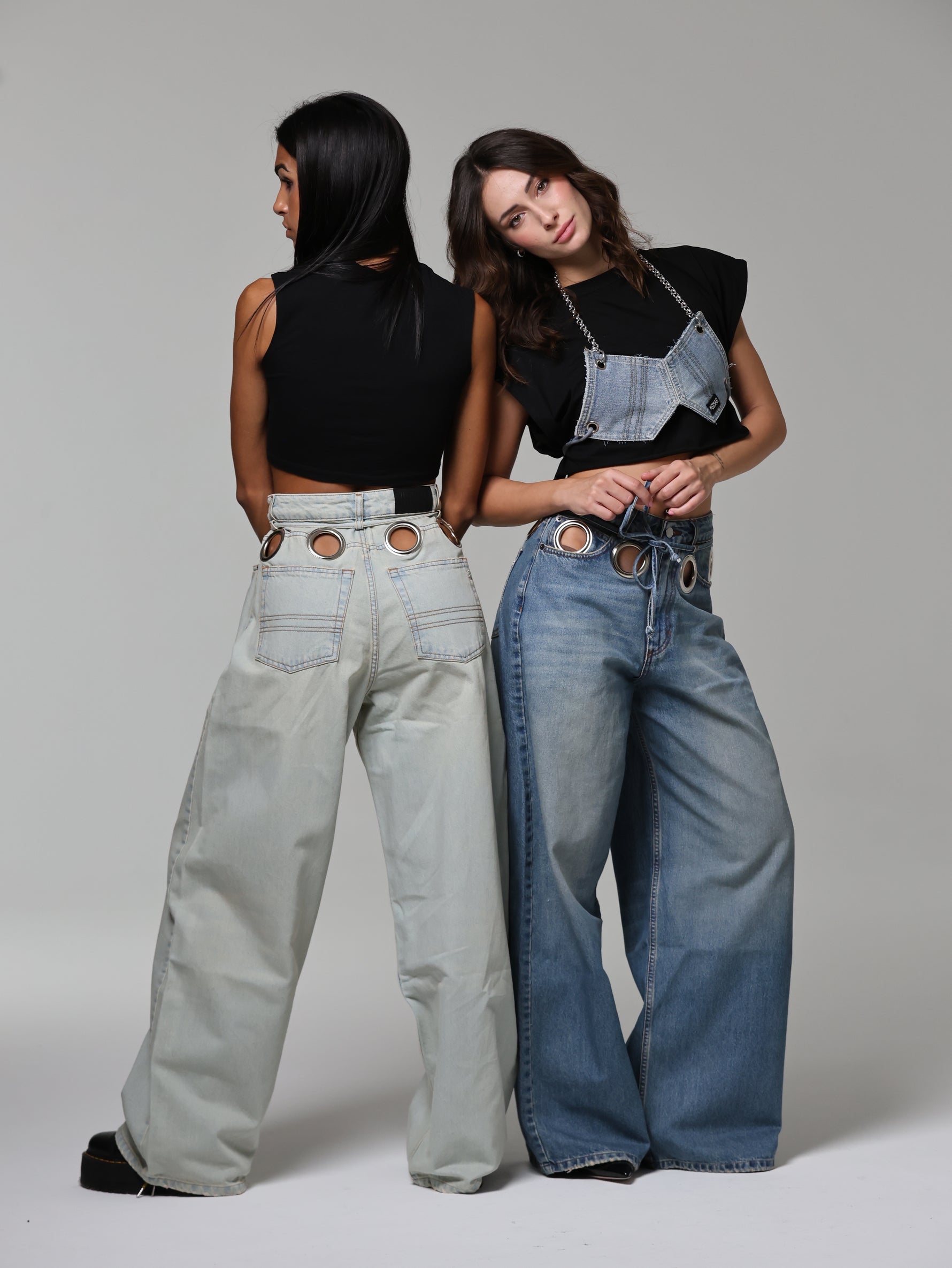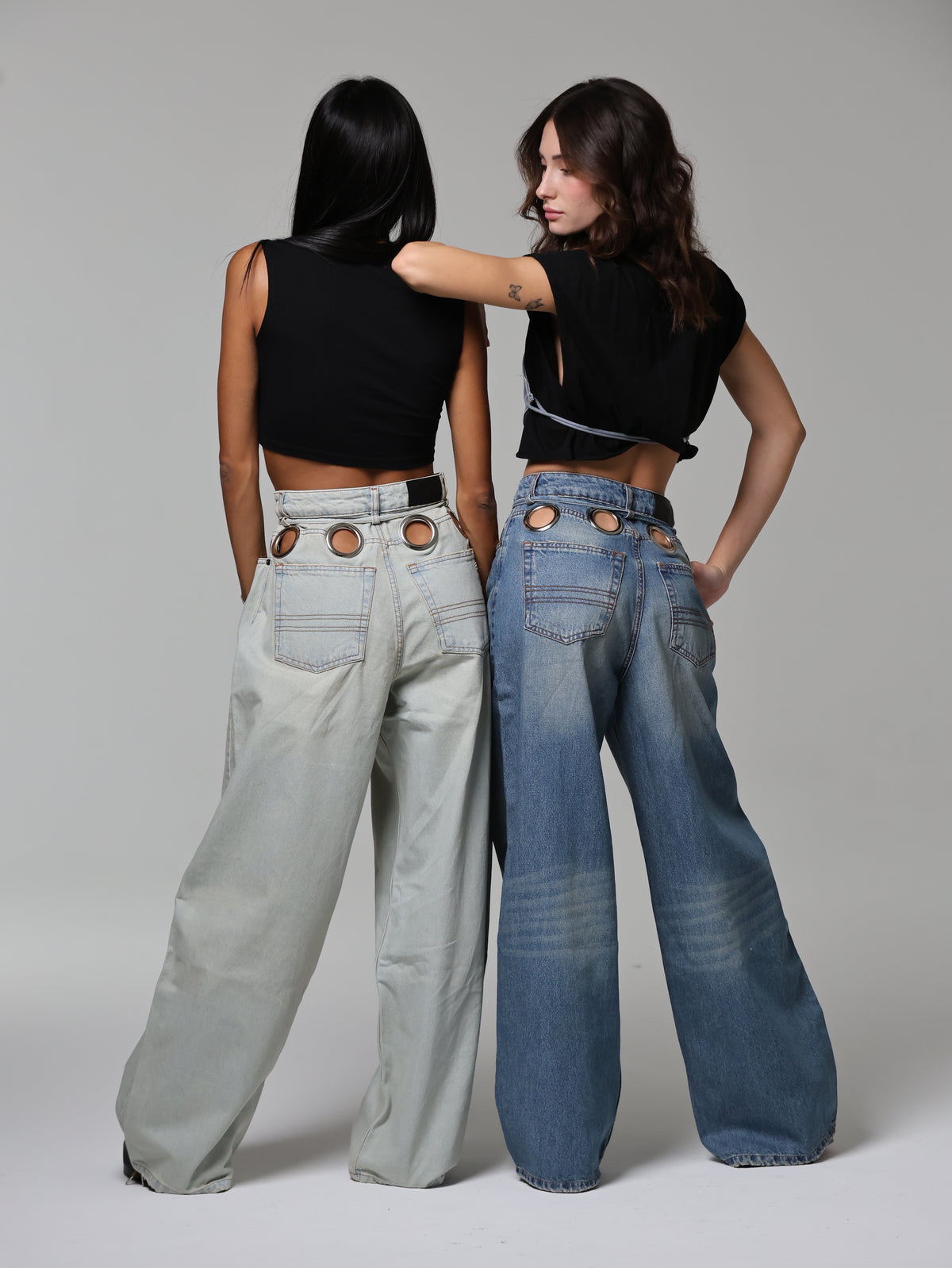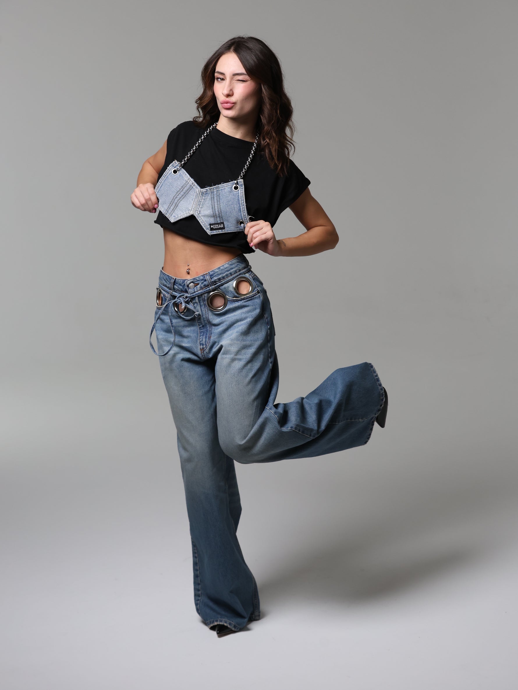 Un jeans che cattura subito lo sguardo grazie agli occhielli oversize che abbracciano la vita. Audace e magnetico, questo capo diventa subito il pezzo chiave di ogni outfit.