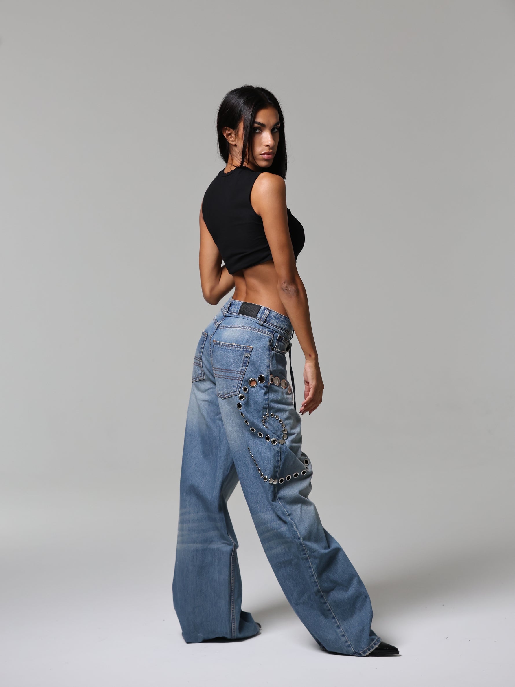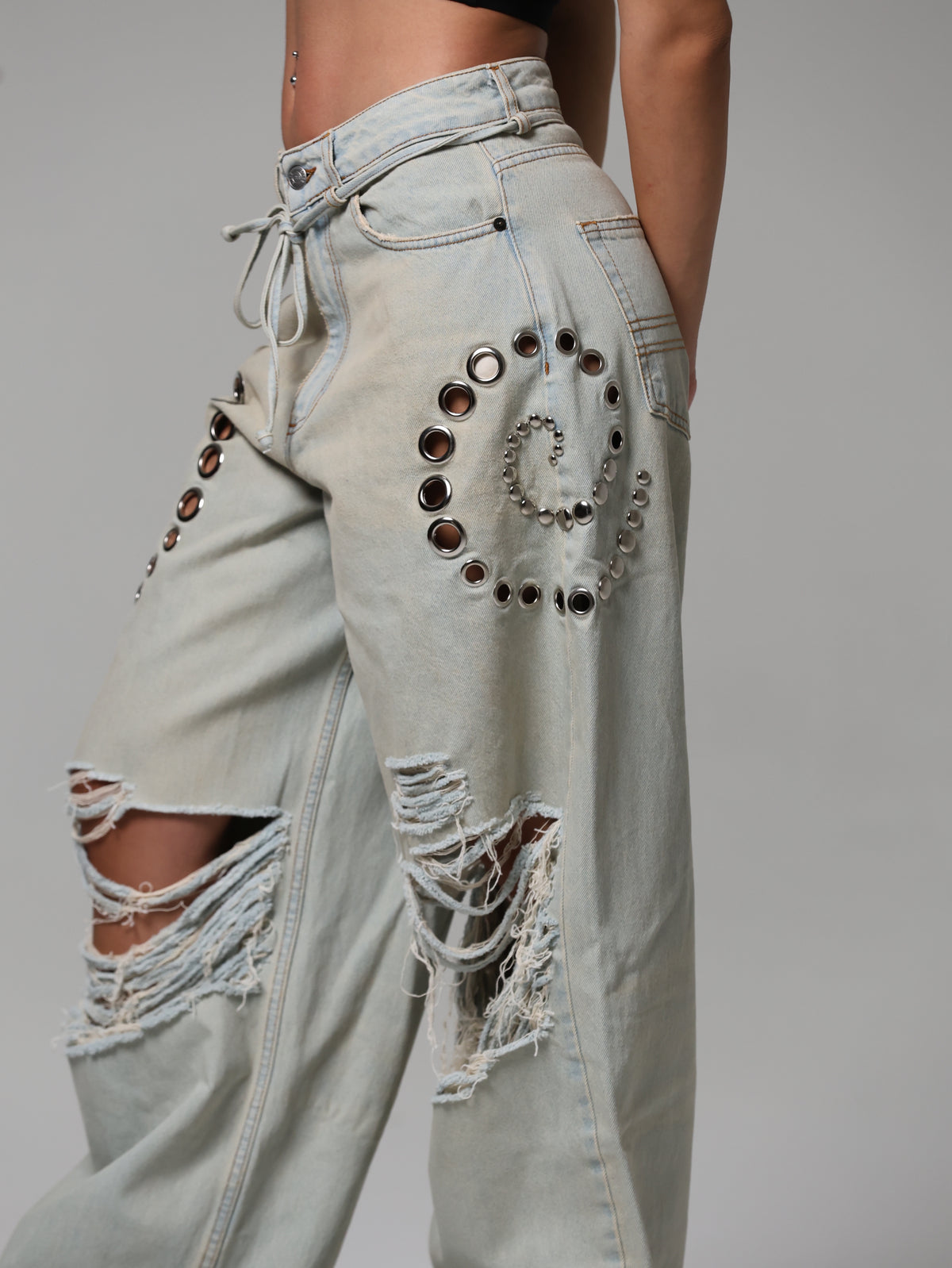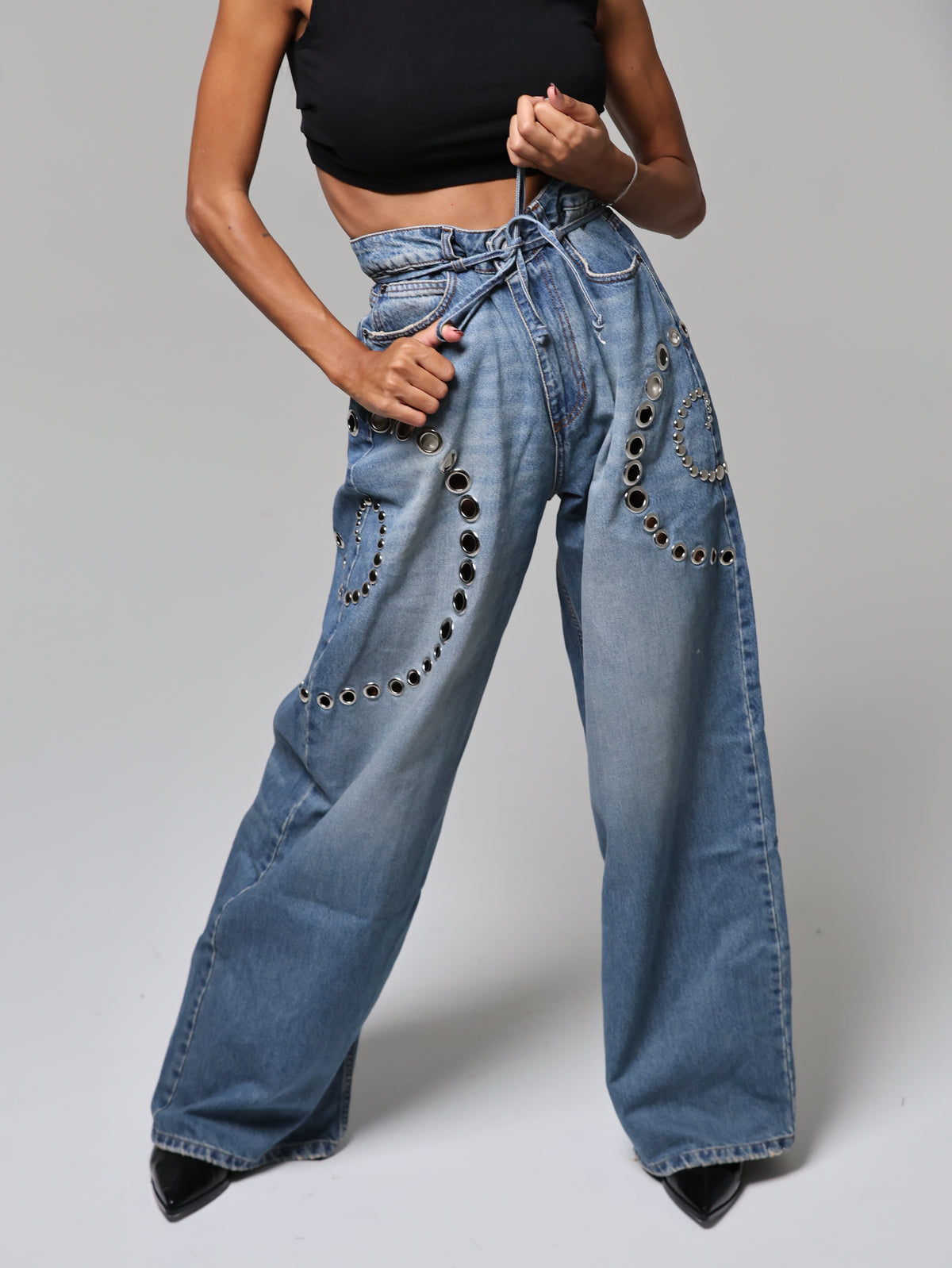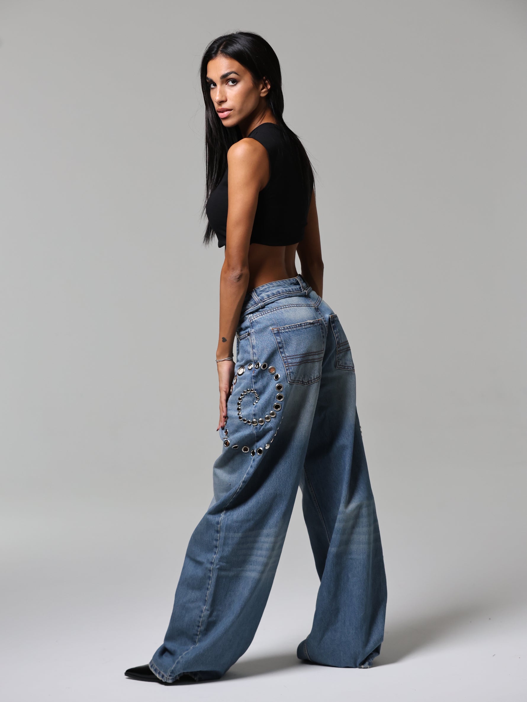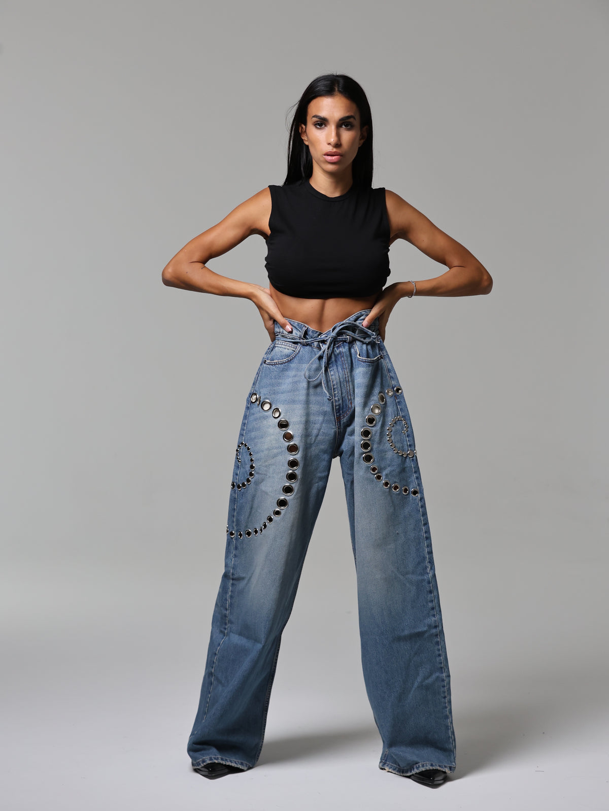 Un jeans che è una versa espressione di stile: le spirali di borchie e occhielli ai lati renderanno il tuo look audace e ipnotico. Un capo che cattura lo sguardo e rivela una personalità che non ha paura di distinguersi.