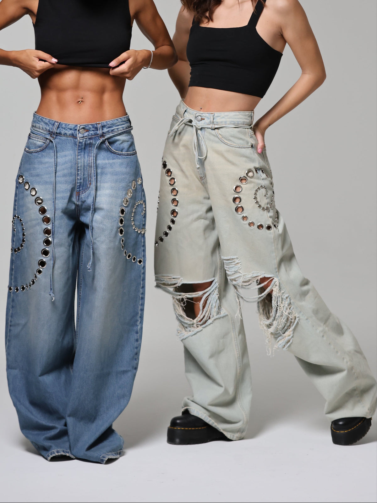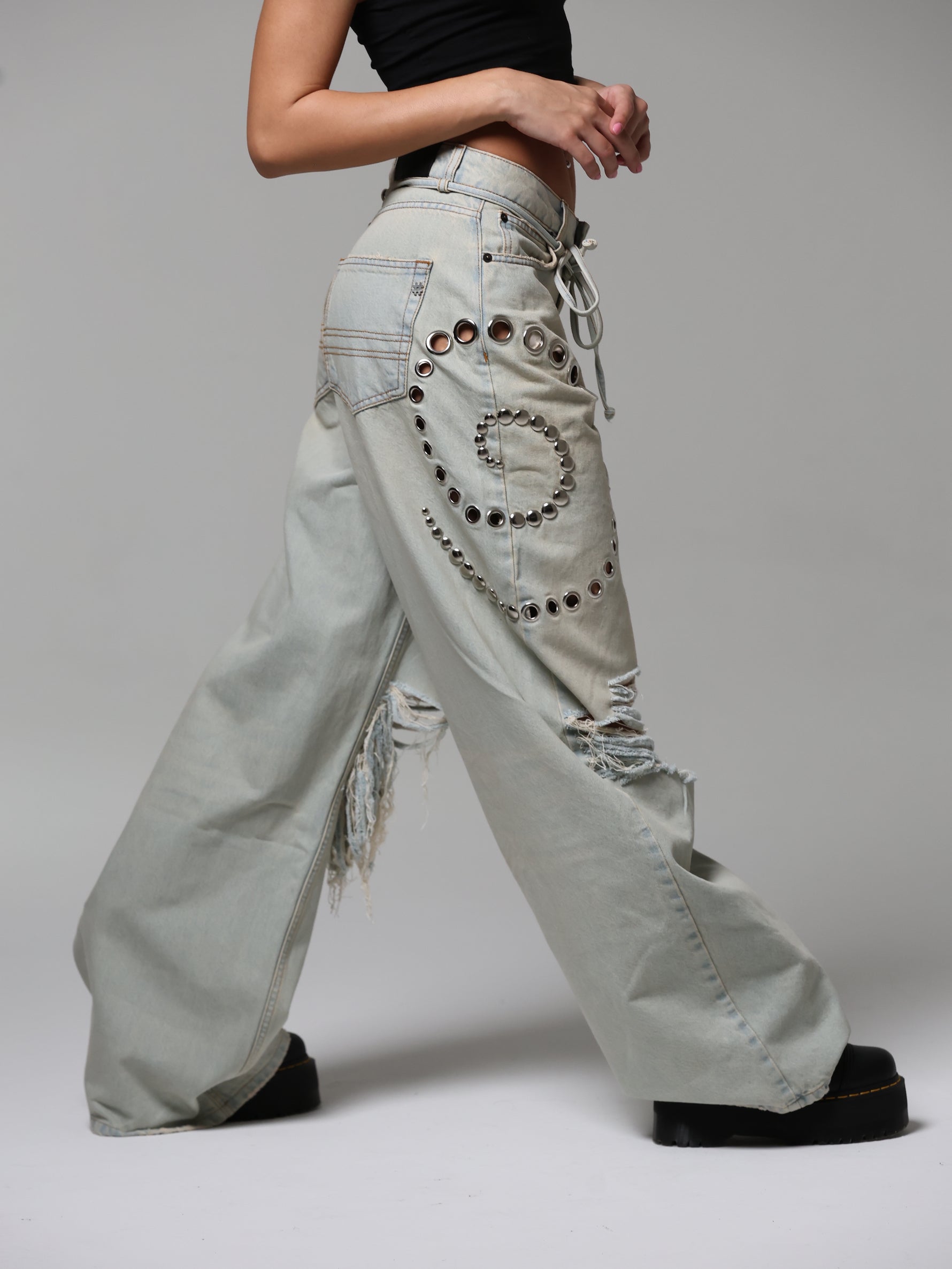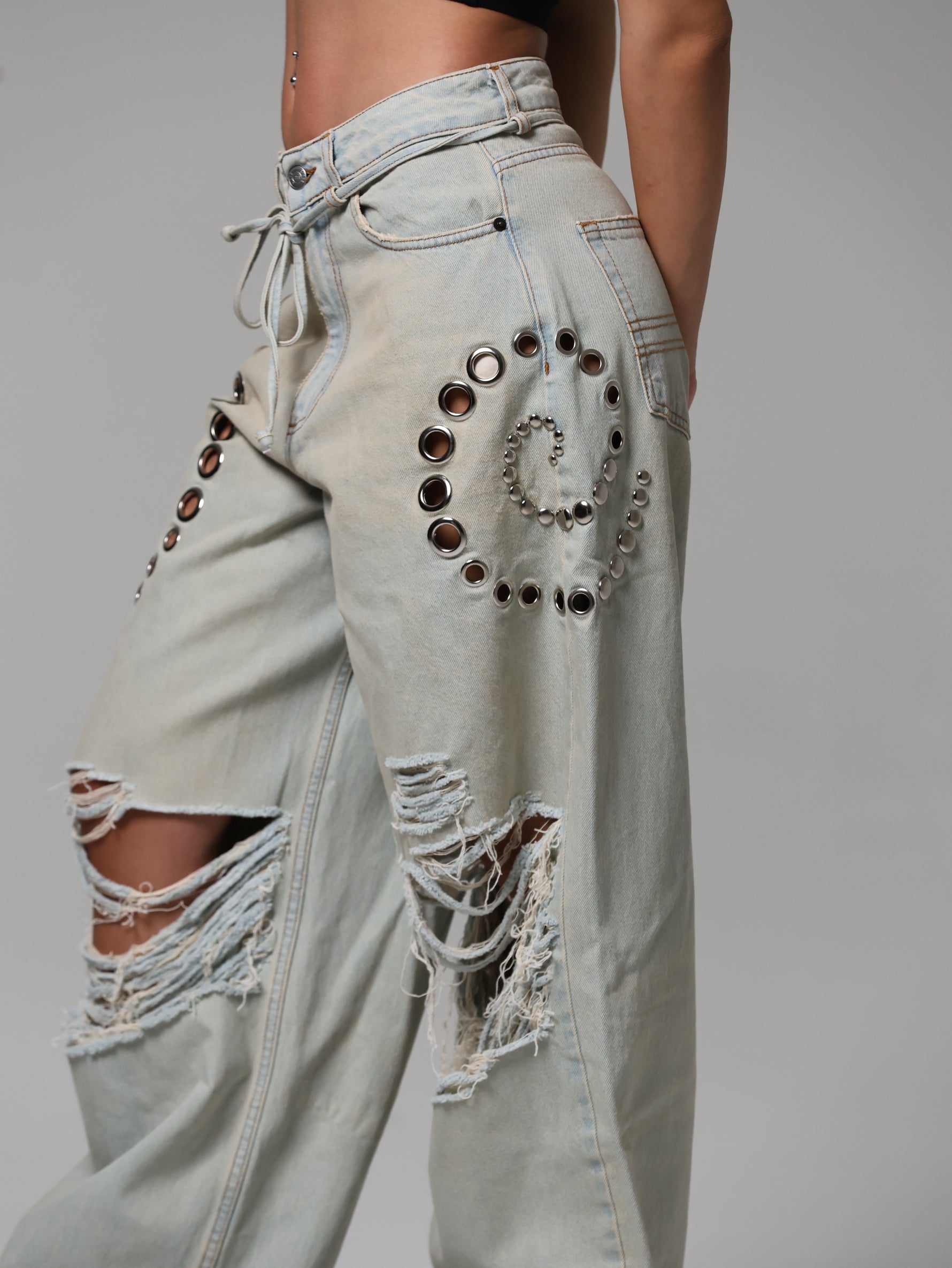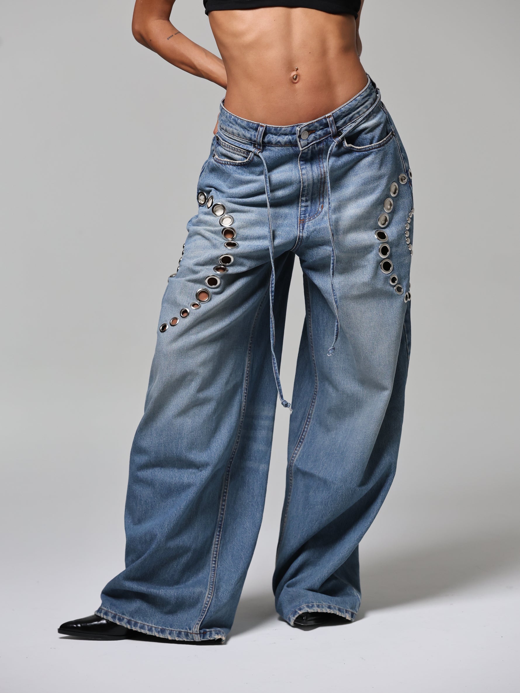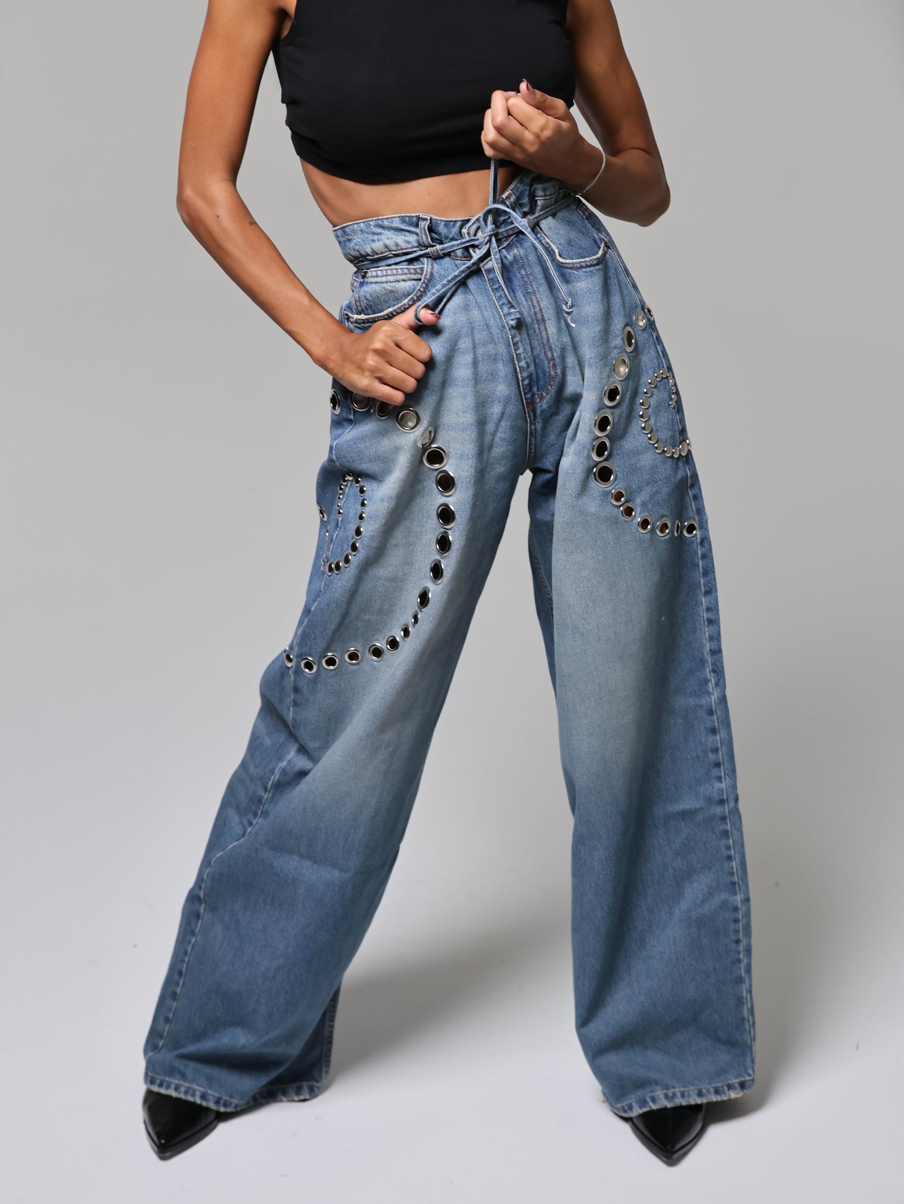 Un jeans che è una versa espressione di stile: le spirali di borchie e occhielli ai lati renderanno il tuo look audace e ipnotico. Un capo che cattura lo sguardo e rivela una personalità che non ha paura di distinguersi.