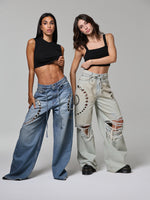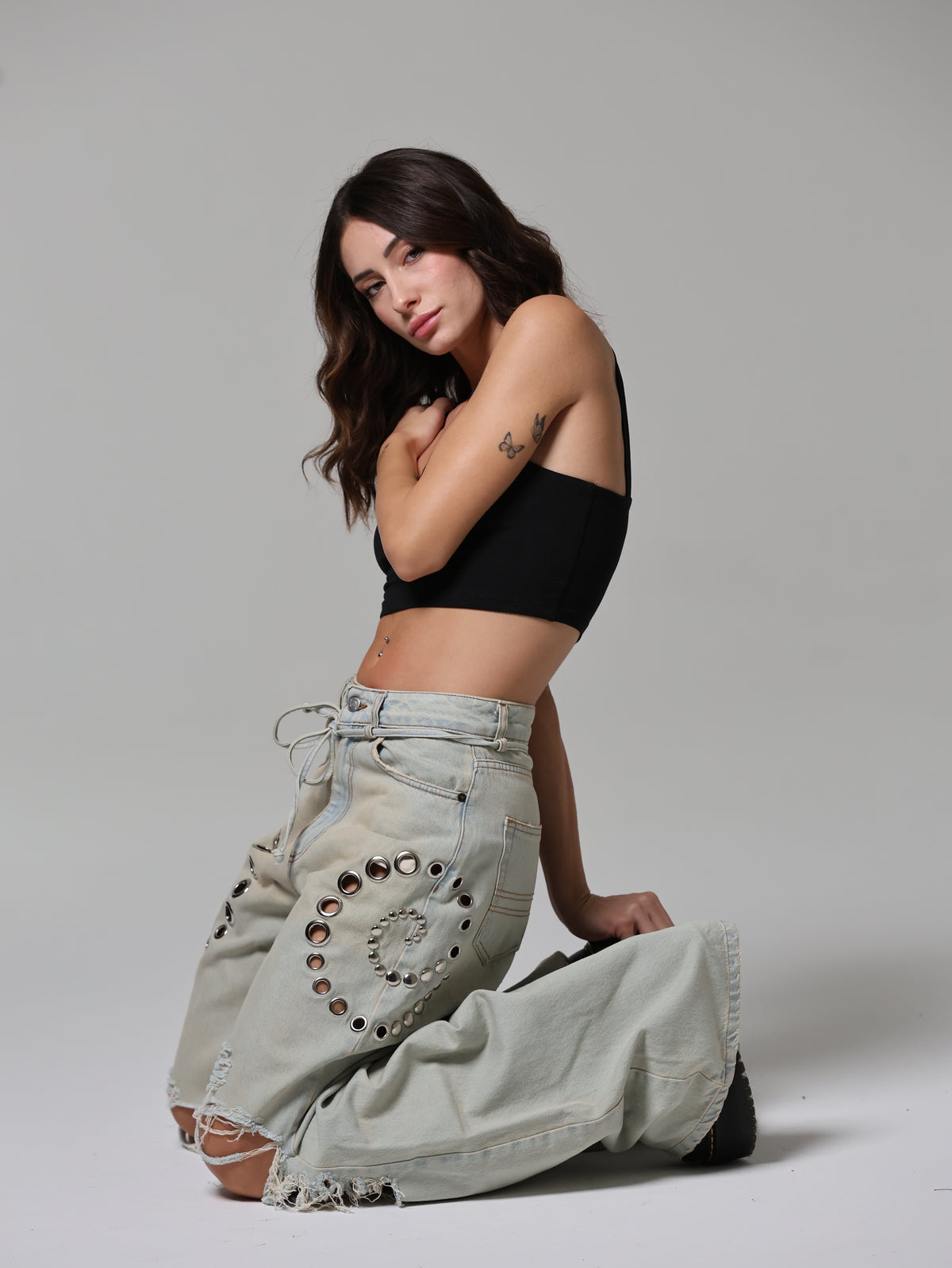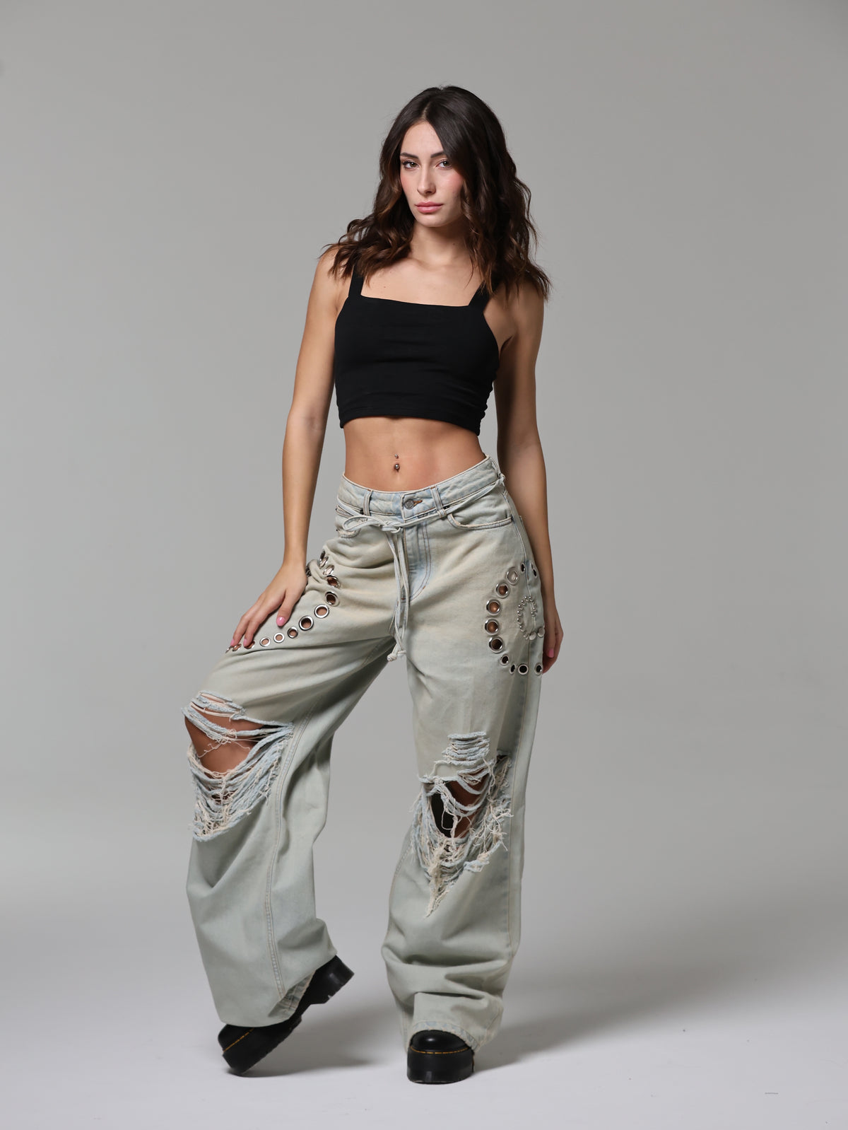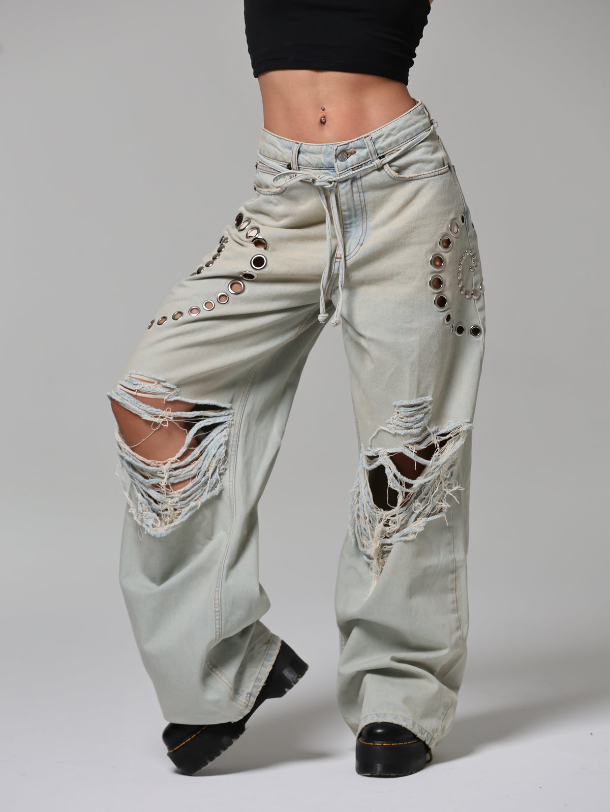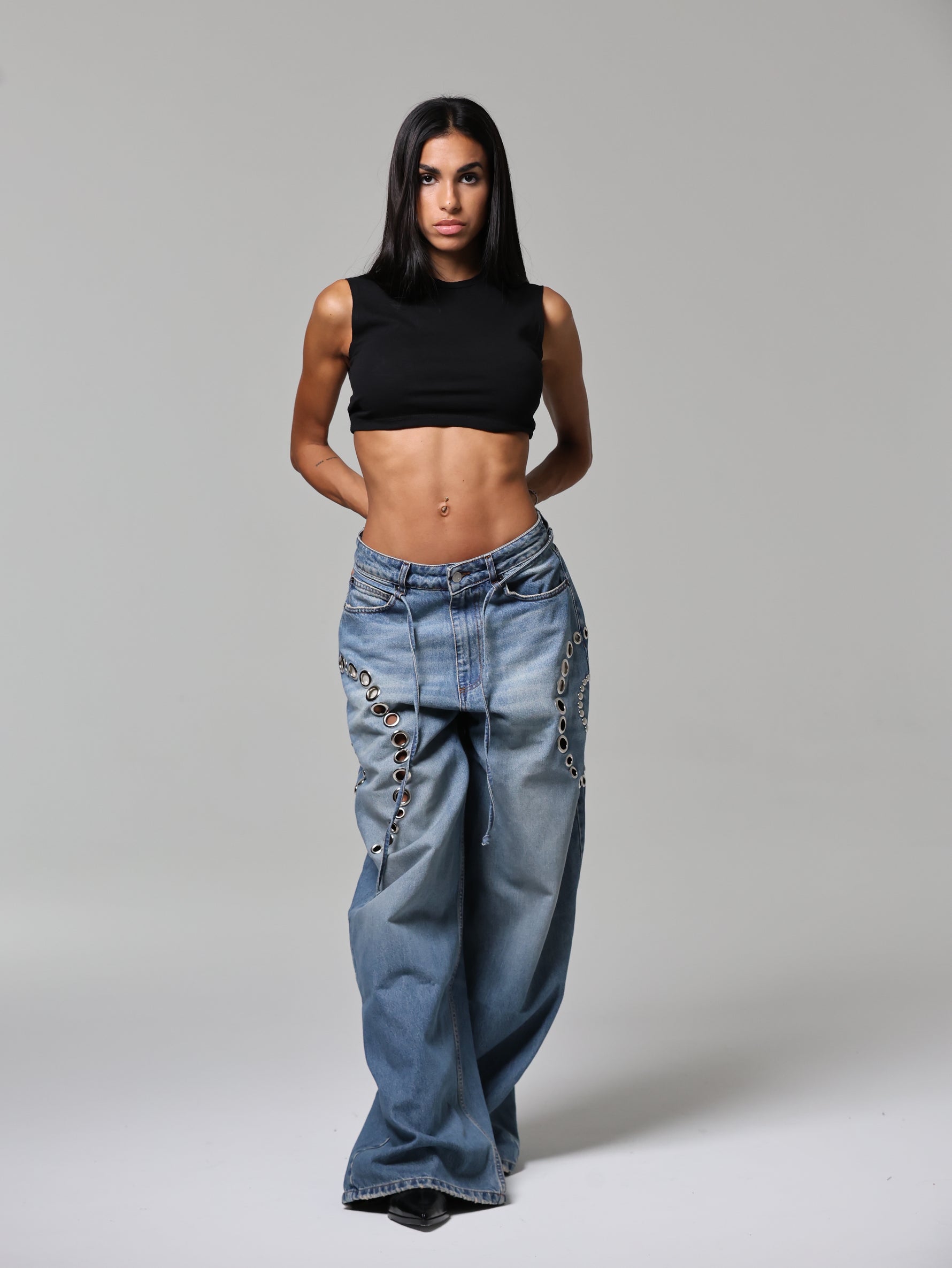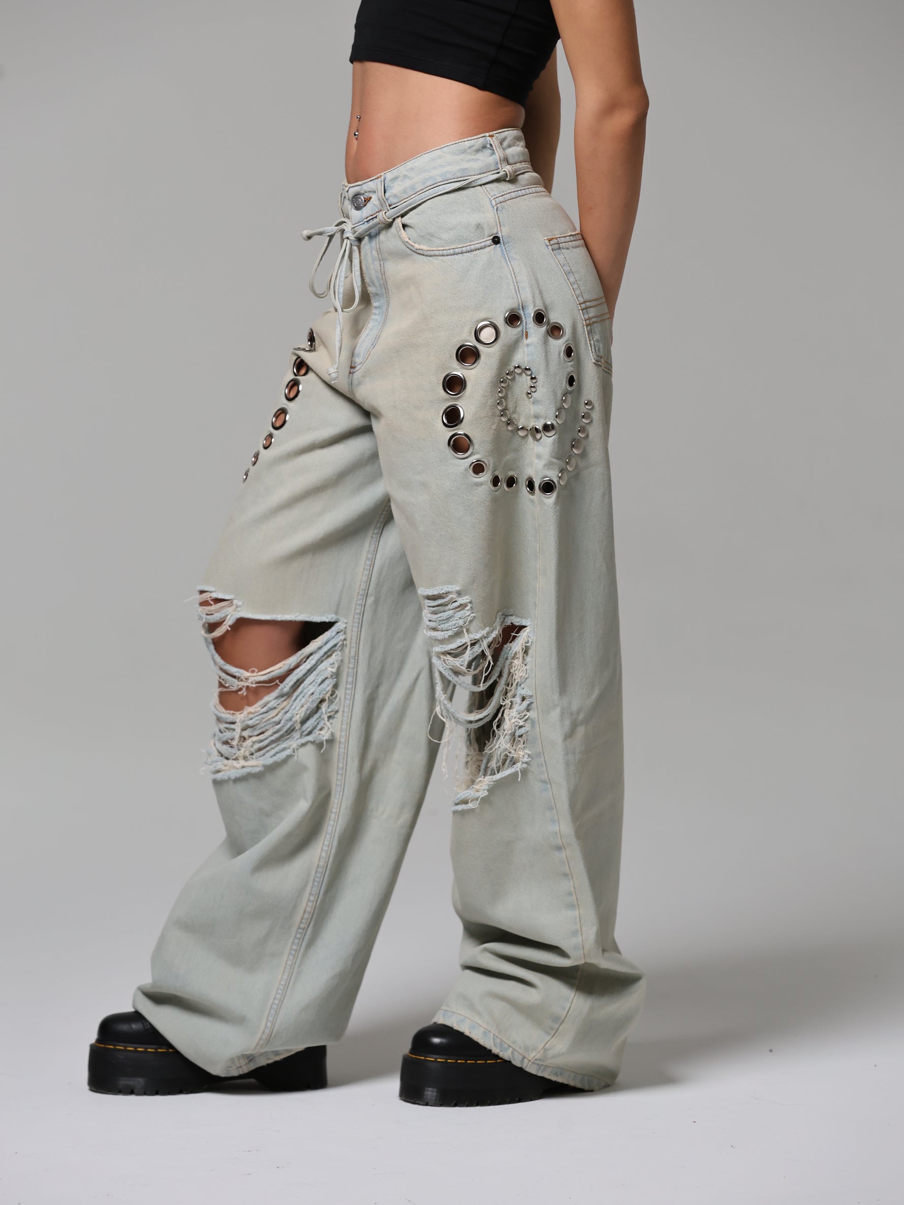 Un jeans che è una versa espressione di stile: le spirali di borchie e occhielli ai lati renderanno il tuo look audace e ipnotico. Un capo che cattura lo sguardo e rivela una personalità che non ha paura di distinguersi.